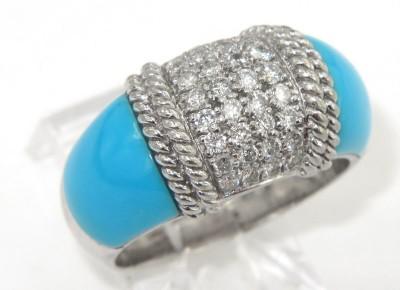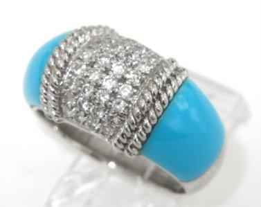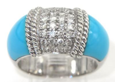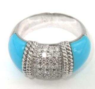 18K White Gold Diamond And Turquoise Ring. The total ring's weight is 7.4 grams. Total weight of diamond: 0.96 cts, approximately, H color, VS clarity. The size of turquoise: 8 x 8 mm. The measurement of ring surface: 22 x 10 mm and 4 mm in thickness. The size of the ring is 7.