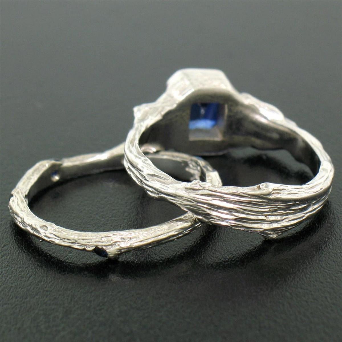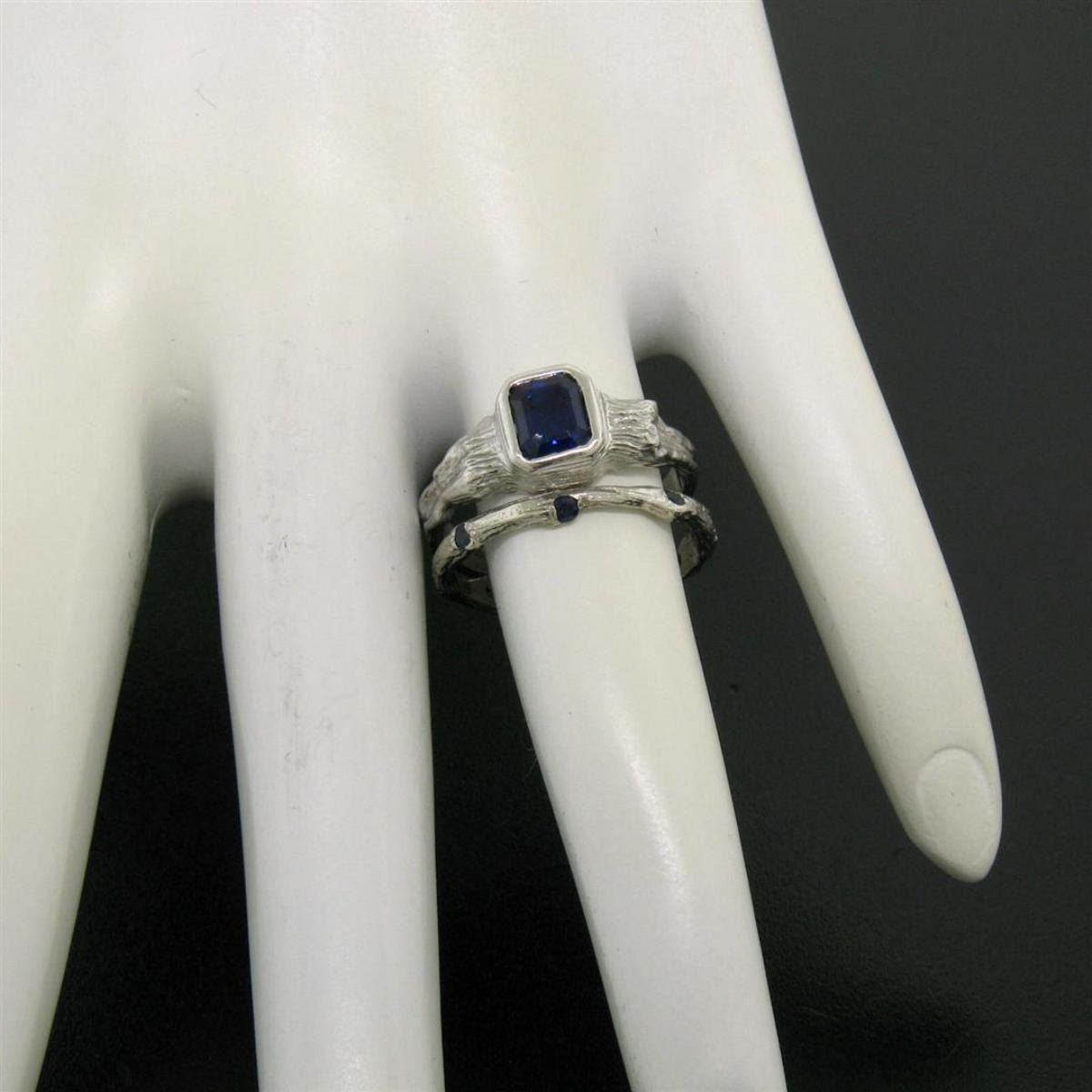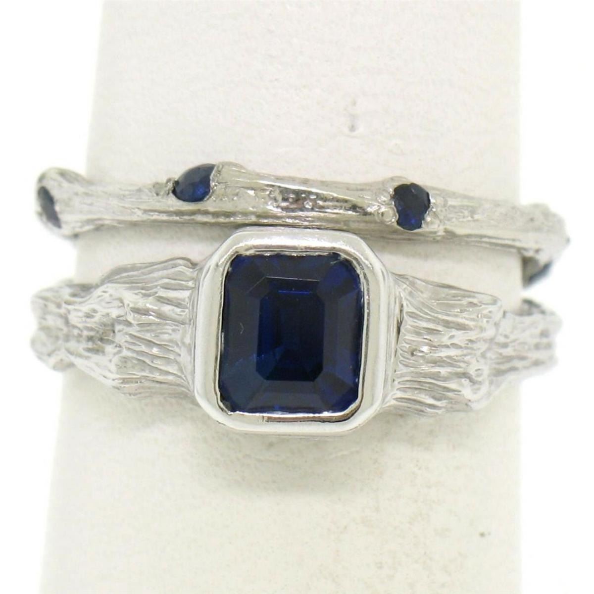 One Estate Branch Textured 18K White Gold 1.25ctw Sapphire Solitaire Ring & Band Set. Item Details: Material: 18K Solid White Gold, Weight: 7.40 Grams (combined), Stone(s): (1) Natural Genuine Sapphire - Emerald Cut - Bezel Set - Very Nice Royal Blue Color - 1.05ct (approx.) VERY FINE SAPPHIRE!, (5) Natural Genuine Sapphire - Round Cut - Bead Set - Royal Blue Color - 0.20ctw (approx.), Total Carat Weight: 1.25 (approx.), Ring Size: 5.75 (solitaire) - 5.50 (band), Ring Width: 7.22mm (solitaire) - 2.53mm (band), Ring Height: 4.90mm rise off the finger (solitaire) - 1.65mm rise off the finger (band). Condition: Estate, like new!