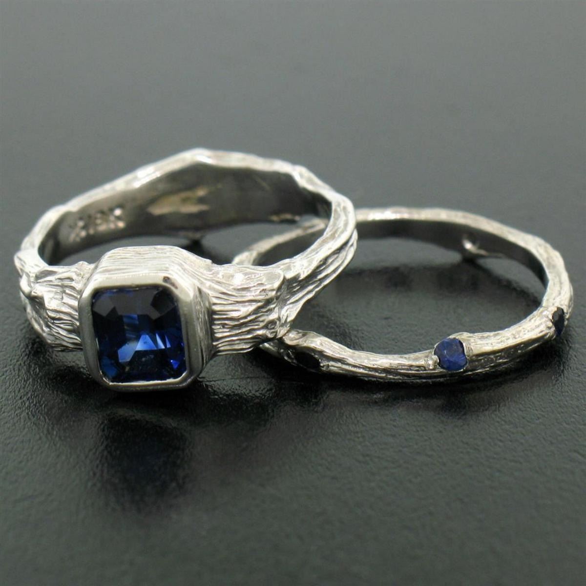One Estate Branch Textured 18K White Gold 1.25ctw Sapphire Solitaire Ring & Band Set. Item Details: Material: 18K Solid White Gold, Weight: 7.40 Grams (combined), Stone(s): (1) Natural Genuine Sapphire - Emerald Cut - Bezel Set - Very Nice Royal Blue Color - 1.05ct (approx.) VERY FINE SAPPHIRE!, (5) Natural Genuine Sapphire - Round Cut - Bead Set - Royal Blue Color - 0.20ctw (approx.), Total Carat Weight: 1.25 (approx.), Ring Size: 5.75 (solitaire) - 5.50 (band), Ring Width: 7.22mm (solitaire) - 2.53mm (band), Ring Height: 4.90mm rise off the finger (solitaire) - 1.65mm rise off the finger (band). Condition: Estate, like new!