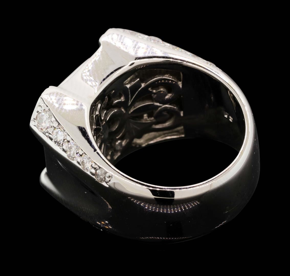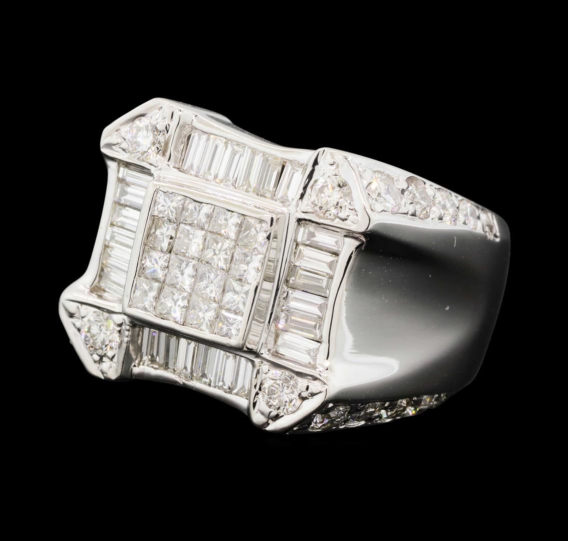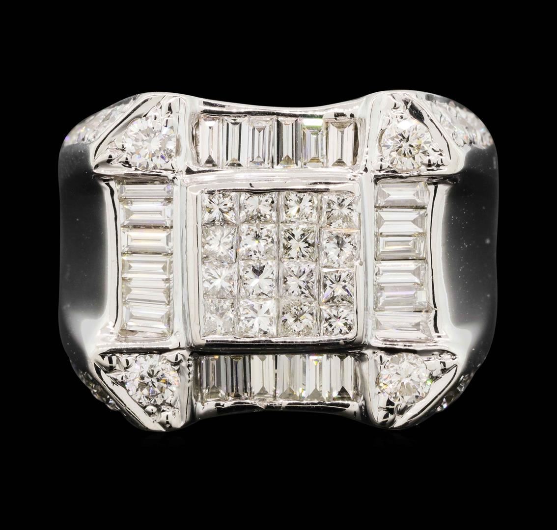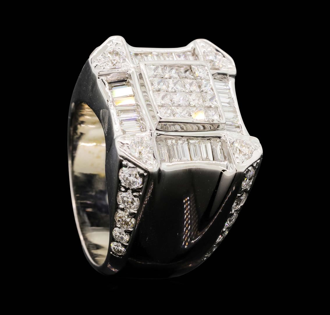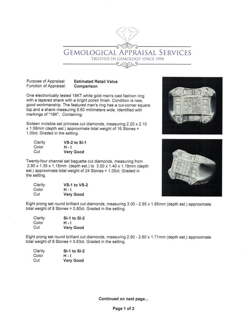 One electronically tested 18KT white gold man's cast fashion ring with a tapered shank with a bright polish finish. The featured man's ring has a cut-corner square top and a shank measuring 9.60 millimeters wide. Identified with markings of "18K". Condition is new, good workmanship. Containing: Sixteen invisible set princess cut diamonds, measuring 2.20 x 2.10 x 1.58mm (depth est.) approximate total weight of 16 Stones = 1.00ct. Graded in the setting. Color H - I Clarity VS-2 to SI-1 Cut Very Good Twenty-Four channel set baguette cut diamonds, measuring from 2.90 x 1.35 x 1.15mm (depth est.) to 3.00 x 1.40 x 1.19mm (depth est.) approximate total weight of 24 Stones = 1.05ct. Graded in the setting. Color H - I Clarity VS-1 to VS-2 Cut Very Good Eight prong set round brilliant cut diamonds, measuring 3.00 - 2.95 x 1.85mm (depth est.) approximate total weight of 8 Stones = 0.80ct. Graded in the setting. Color H - I Clarity SI-1 to SI-2 Cut Very Good Eight prong set round brilliant cut diamonds, measuring 2.90 - 2.60 x 1.71mm (depth est.) approximate total weight of 8 Stones = 0.63ct. Graded in the setting. Color H - I Clarity SI-1 to SI-2 Cut Very Good Eight prong set round brilliant cut diamonds, measuring 2.40 - 2.00 x 1.36mm (depth est.) approximate total weight of 8 Stones = 0.32ct. Graded in the setting. Color H - I Clarity SI-1 to I-1 Cut Good. Total Weight of Diamonds 3.80ct. Total Weight of Ring 35.70gm. GAS Appraised.