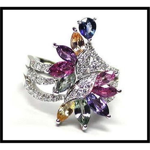 A spectacular 18K white gold ring with natural sapphires of fancy rare colors and 56 diamonds is a show-stopper. The sapphires weigh well over 3 1/4 carats or more. The ring weighs 11.21 grams. It measures 24mm (almost 1") long. Size 7 1/2. Price on our estate sale was $5800.