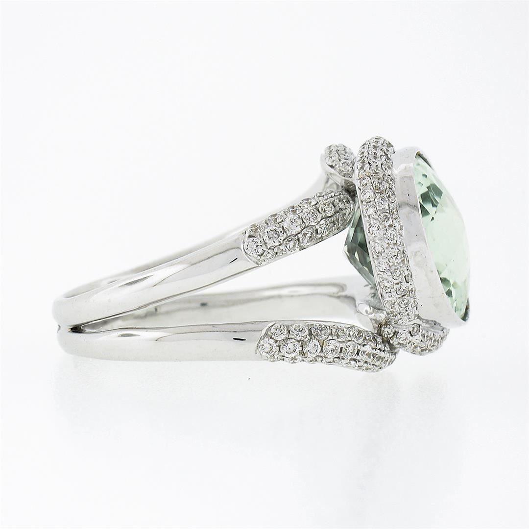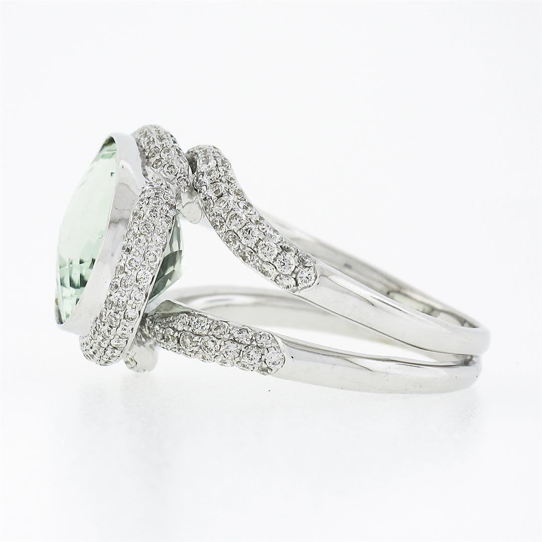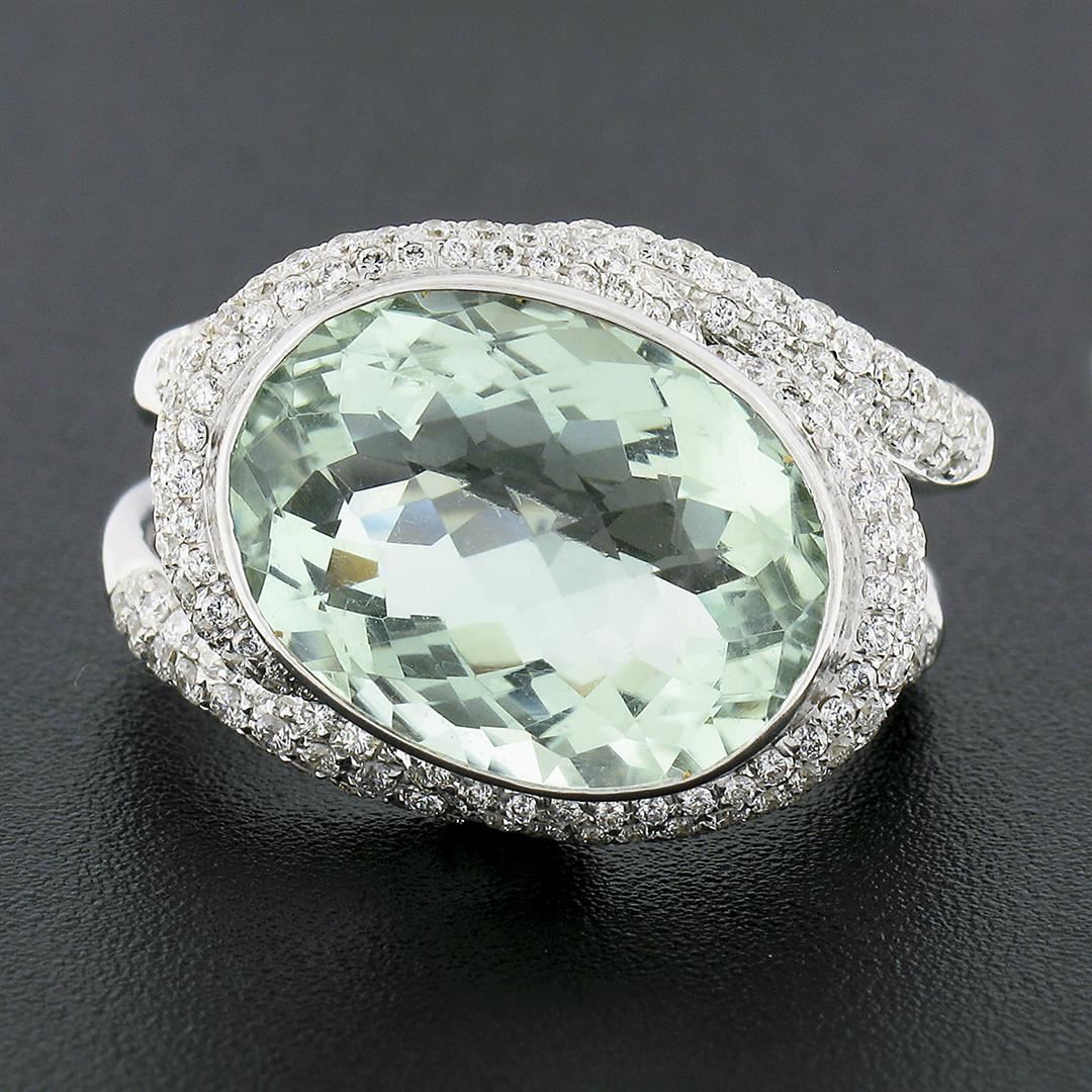 A solid 18k white gold ring, with 1 oval cut natural genuine prasiolite quartz (15.8x12.1mm), and numerous of round brilliant cut natural diamonds (F/G - VS1/VS2 ; 1.40ctw). The ring is size 9.5, weighs a total of 13.91 grams, and measures 16.40mm wide.