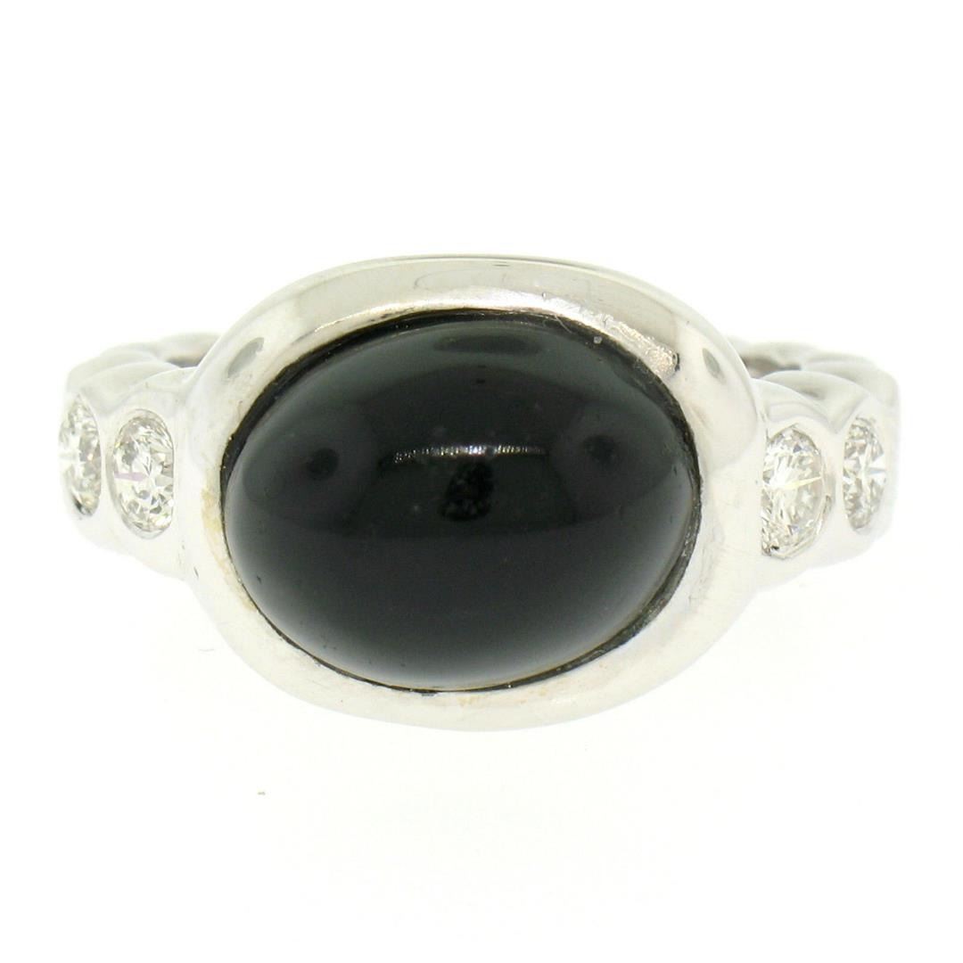 One 18K Solid White Gold Oval Bezel Set Black Onyx Burnish Set Diamond Bubble Ring. Item Details - Material: 18K Solid White Gold, Weight: 7.9 Grams, Stone(s): (1) Natural Genuine Black Onyx - Oval Shape - Bezel Set - Black Color - 11.49x9.20mm (approx.), (4) Natural Genuine Diamonds - Round Brilliant Cut - Burnish Set - G Color - SI1 Clarity - 0.45ctw (approx.), Total Carat Weight: 0.45 (approx.), Ring Size: 6.0, Ring Width: 11.78mm, Ring Height: 7.78mm rise off the finger, Condition: Excellent condition!