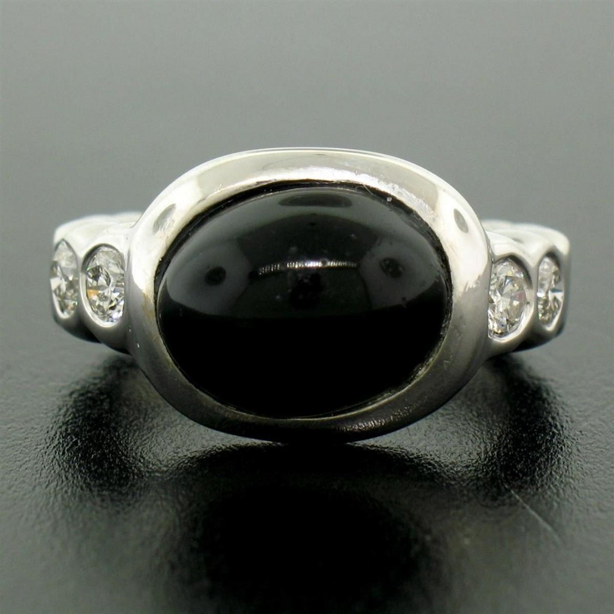 One 18K Solid White Gold Oval Bezel Set Black Onyx Burnish Set Diamond Bubble Ring. Item Details - Material: 18K Solid White Gold, Weight:  7.9 Grams, Stone(s):  (1) Natural Genuine Black Onyx - Oval Shape - Bezel Set - Black Color - 11.49x9.20mm (approx.), (4) Natural Genuine Diamonds - Round Brilliant Cut - Burnish Set - G Color - SI1 Clarity - 0.45ctw (approx.), Total Carat Weight:  0.45 (approx.), Ring Size:  6.0, Ring Width:  11.78mm, Ring Height:  7.78mm rise off the finger, Condition:  Excellent condition!