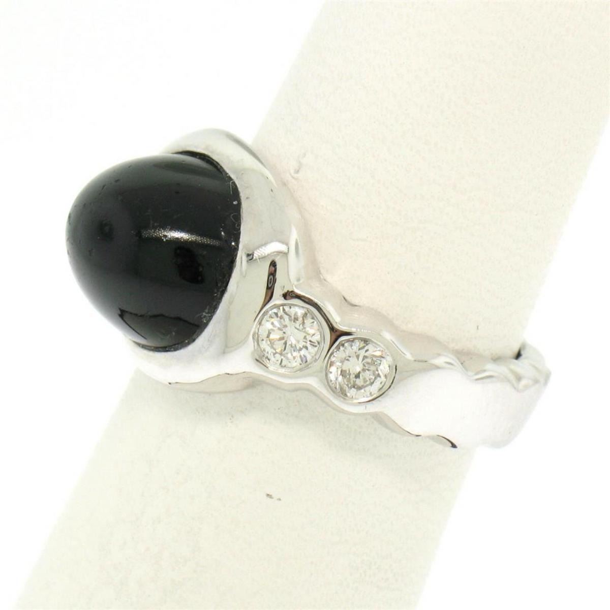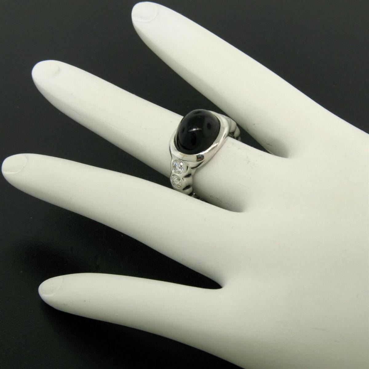 One 18K Solid White Gold Oval Bezel Set Black Onyx Burnish Set Diamond Bubble Ring. Item Details - Material: 18K Solid White Gold, Weight:  7.9 Grams, Stone(s):  (1) Natural Genuine Black Onyx - Oval Shape - Bezel Set - Black Color - 11.49x9.20mm (approx.), (4) Natural Genuine Diamonds - Round Brilliant Cut - Burnish Set - G Color - SI1 Clarity - 0.45ctw (approx.), Total Carat Weight:  0.45 (approx.), Ring Size:  6.0, Ring Width:  11.78mm, Ring Height:  7.78mm rise off the finger, Condition:  Excellent condition!
