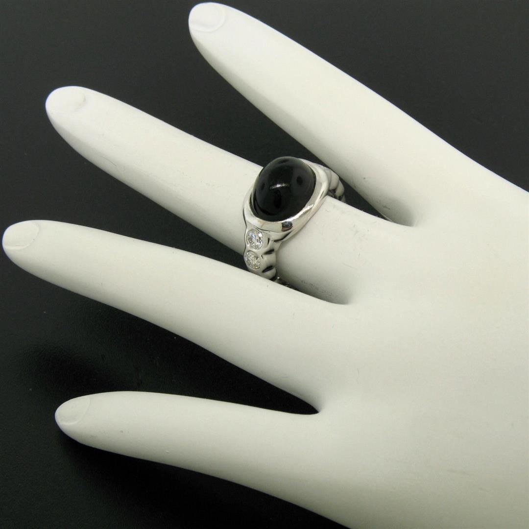 An estate solid 18k white gold bubble ring with 1 oval shape natural black onyx (1.49x9.20mm) and 4 ound brilliant cut natural diamonds (G- SI1; 0.45ctw). The ring is size 6.0, weighs a total of 7.9 grams, and measures 11.78mm wide.