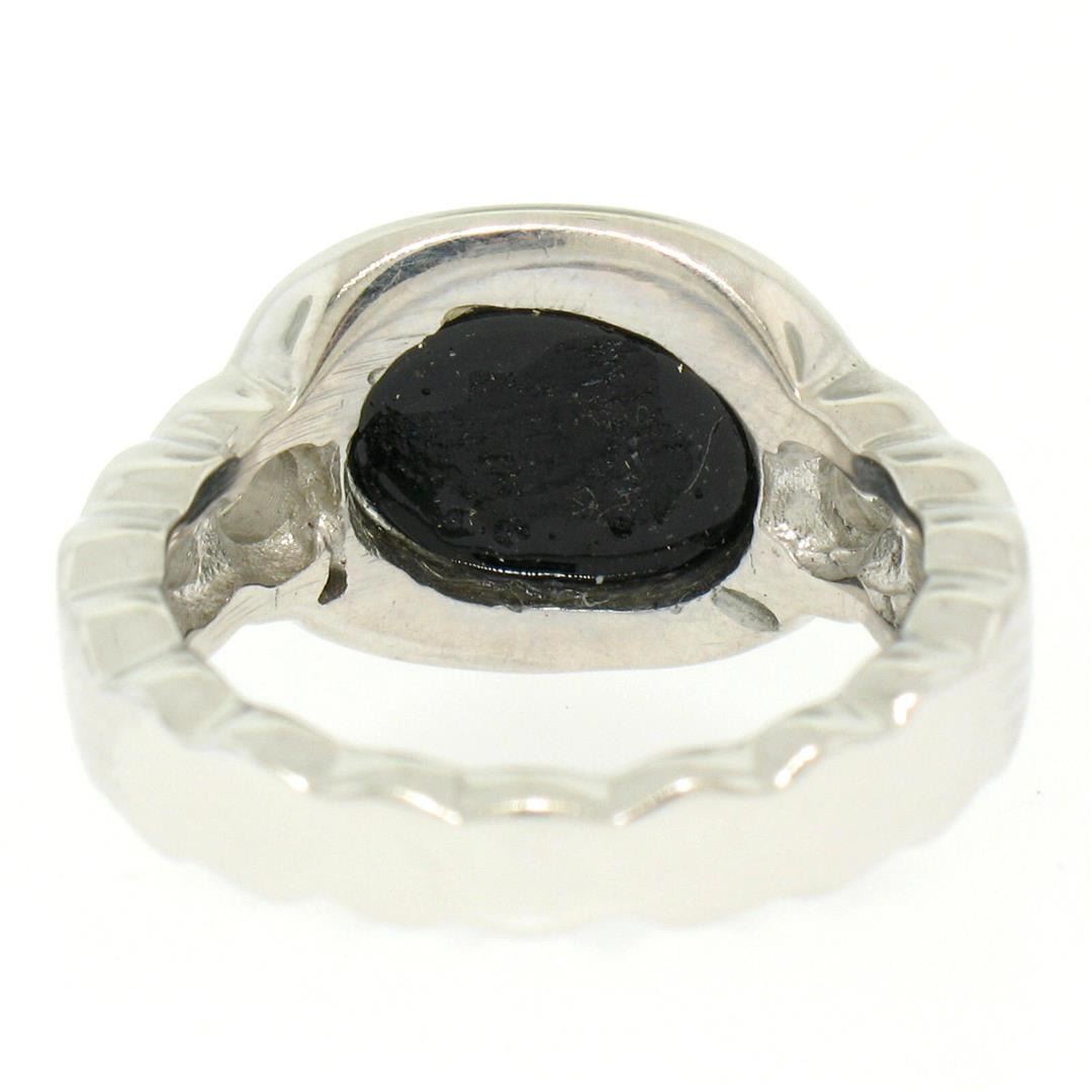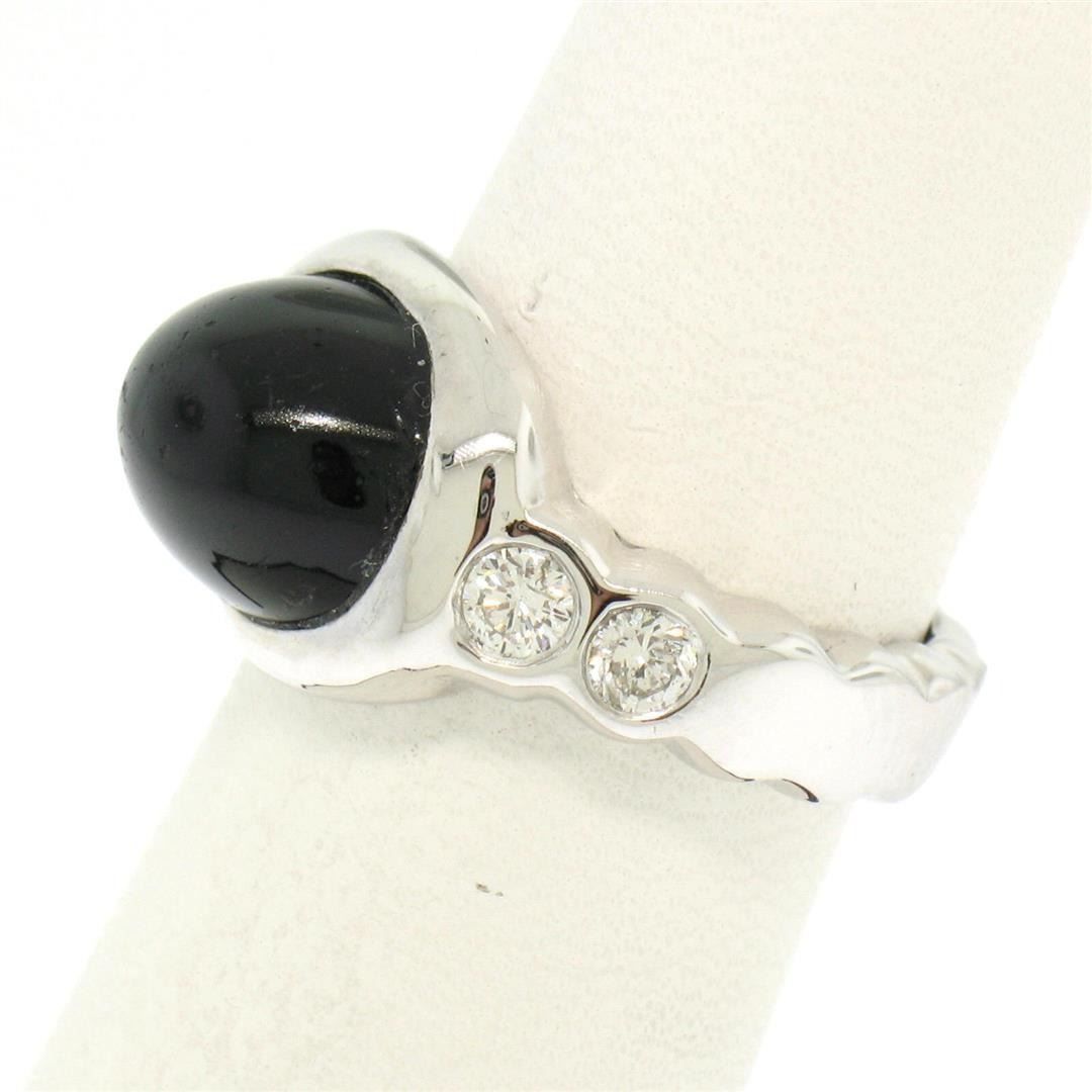 An estate solid 18k white gold bubble ring with 1 oval shape natural black onyx (1.49x9.20mm) and 4 ound brilliant cut natural diamonds (G- SI1; 0.45ctw). The ring is size 6.0, weighs a total of 7.9 grams, and measures 11.78mm wide.