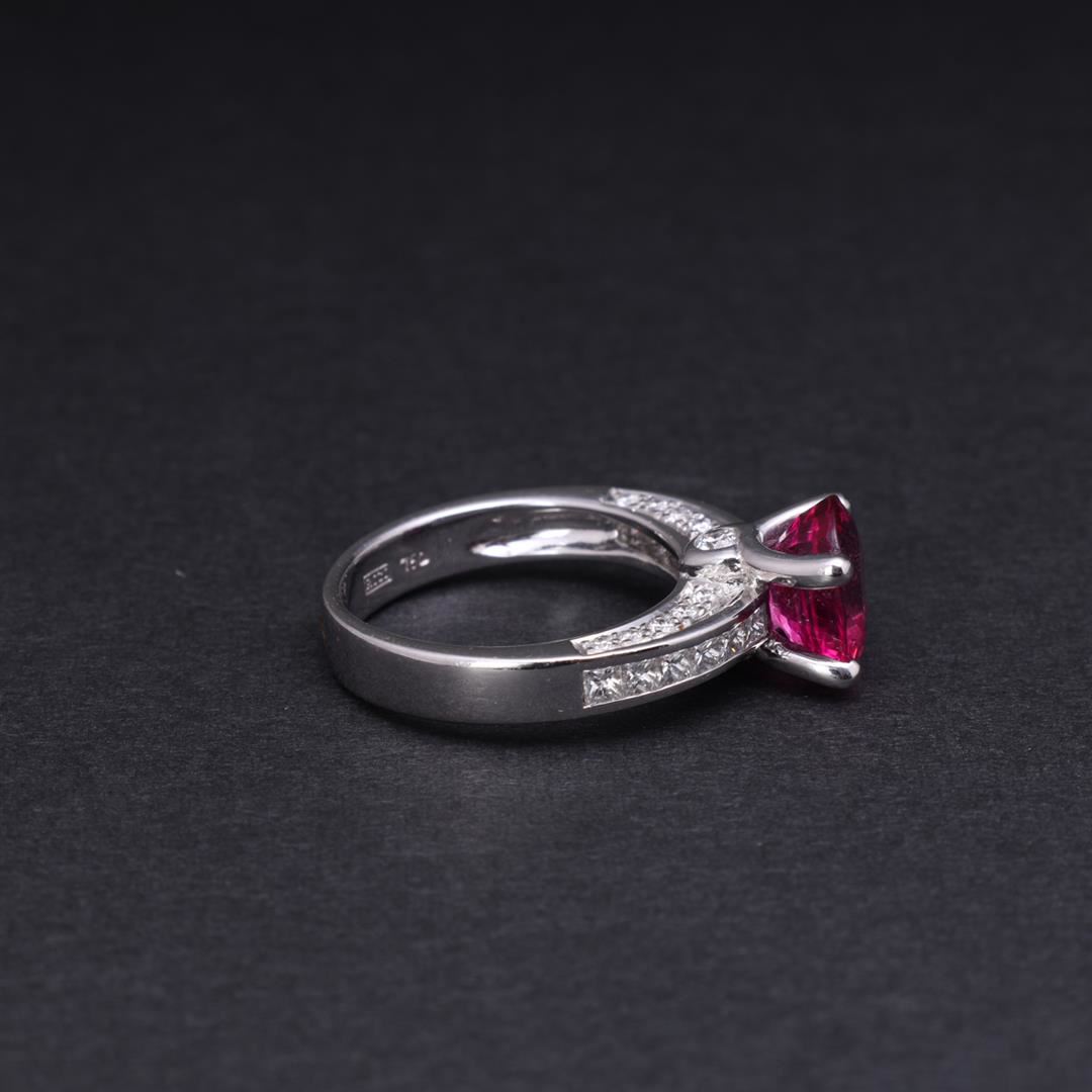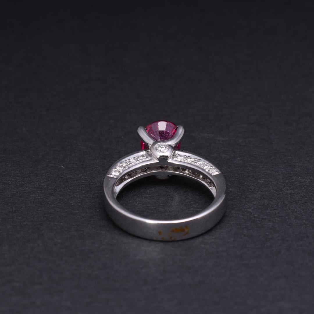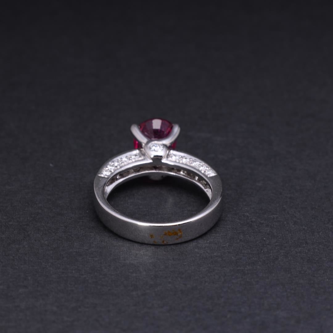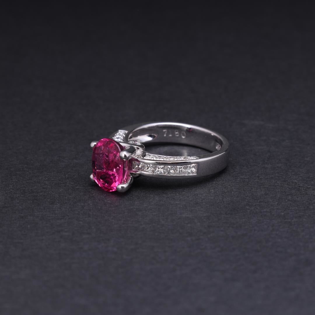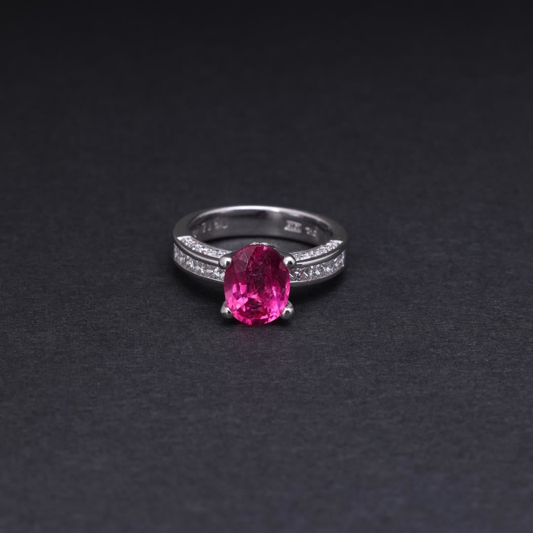 18k white gold ring; featuring a center oval cut claw set pink sapphire with twin dound diamond accents at front and back bases, each shoulder with three rows of diamonds by Carlo Rici, marked 7180 RICI 750 to interior; gross weight 7.6 g, size 6 3/4