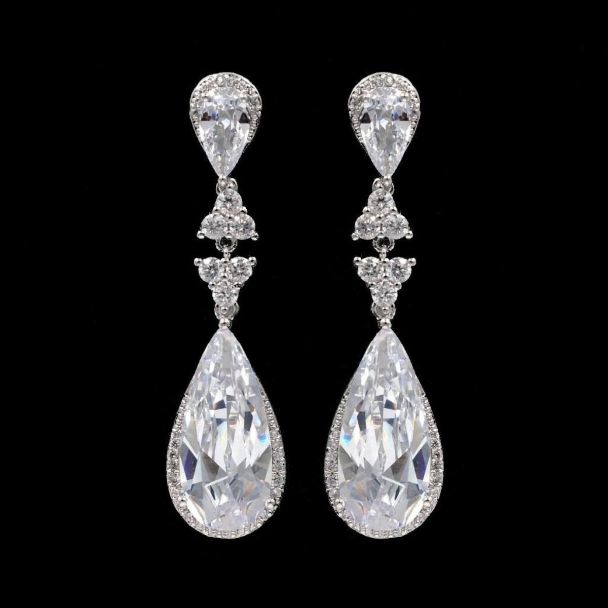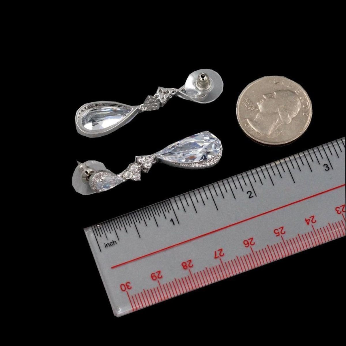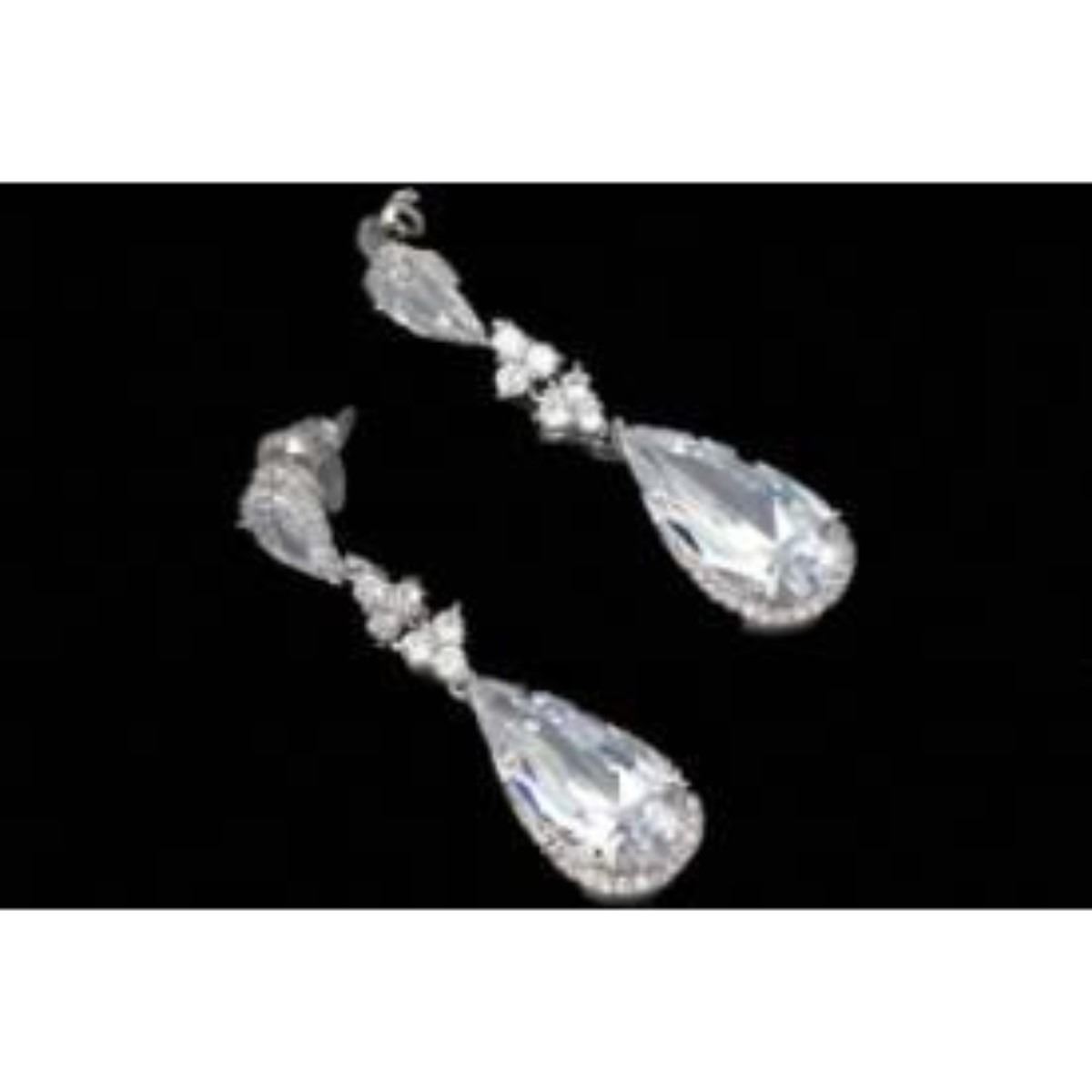 Type: Pierced earrings. Stone: Inlaid AAA grade high quality cubic zirconia. Stone color: Clear. Main stone size: Pear CZ 20 * 9 mm, Pear CZ 9 * 5 mm. Metal: 18k white gold plated copper triple thickness. Length: 1.75". Weight: One earring is 0.19 oz. Quantity: 1 pair