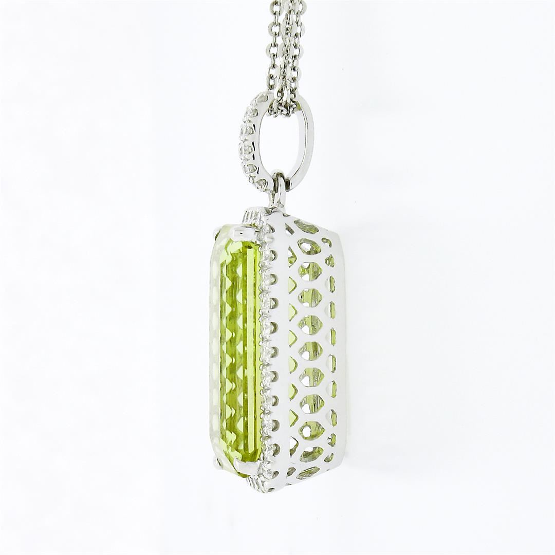 A solid 18k white gold pendnat necklace, with 1 elongated rectangular cut natural lemon quartz (18.15x8.9mm), and 46 round brilliant cut natural diamonds (F/G - VS1/VS2 ; 0.70ctw). 17 inch dual cable link chain, 7.88 grams total weight, pendant measures 29x12mm.