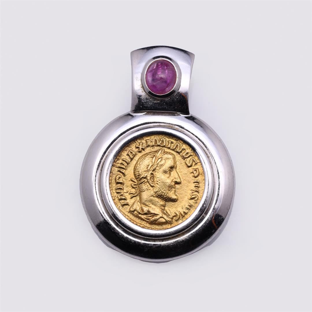 A heavy mounted 18k white gold pendant, marked 750 on the clasp; bezel set with a large pink ruby cabochon; the mount framed of two overlapping bezels with an 18k yellow gold coin cast from an Imperial Roman original; gross weight 16.6 g, 1 1/2" x 1" (app