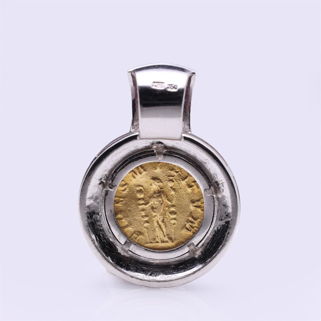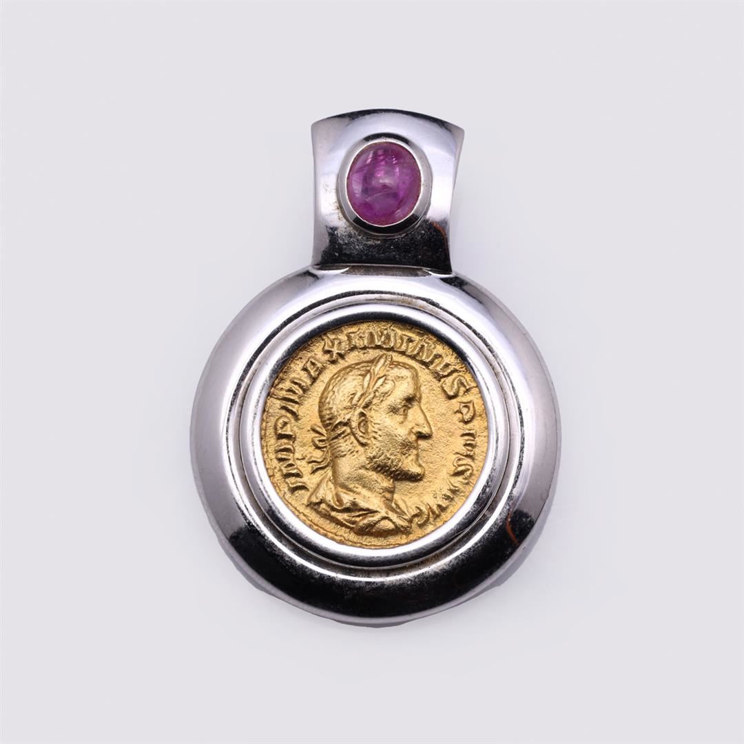 18K White Gold & Ruby Coin Pendant containing oval cabochon ruby weighing approximately 0.50 cts. Total weight of 16.6 gm. Estimated retail value $4,000.