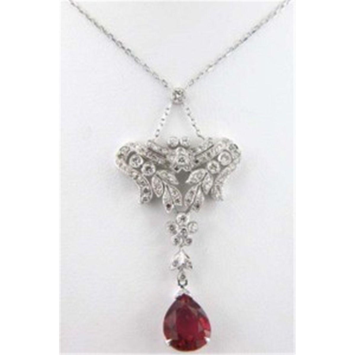 18K White Gold Ruby Diamond Necklace.The total necklace's weight is 7.3 grams.The total weight of the diamond is 0.50 cts, approxmiately. H - I color SI clarity.The weight of the ruby is 3 cts approximately.The length of pendant: 1.8" long. The necklace is 15" long.
