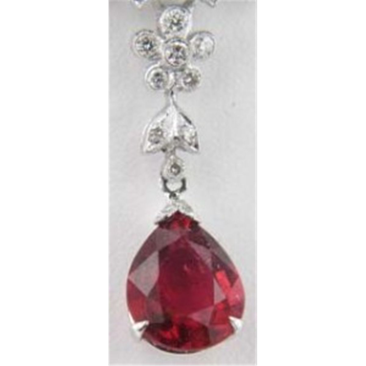 18K White Gold Ruby Diamond Necklace. The total necklace's weight is 7.3 grams. The total weight of the diamond is 0.50 cts, approxmiately. H - I color SI clarity. The weight of the ruby is 3 cts approximately. The length of pendant: 1.8" long. The necklace is 15" long.