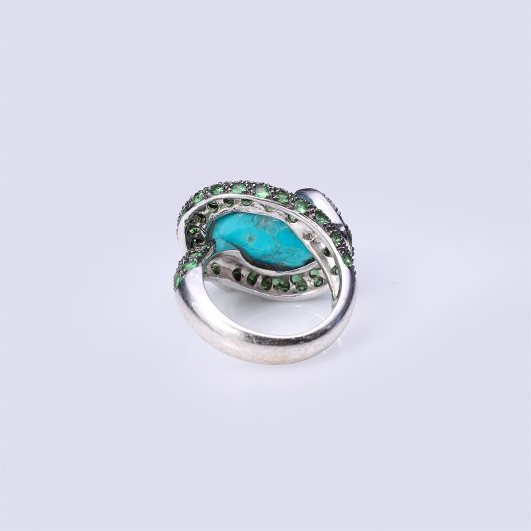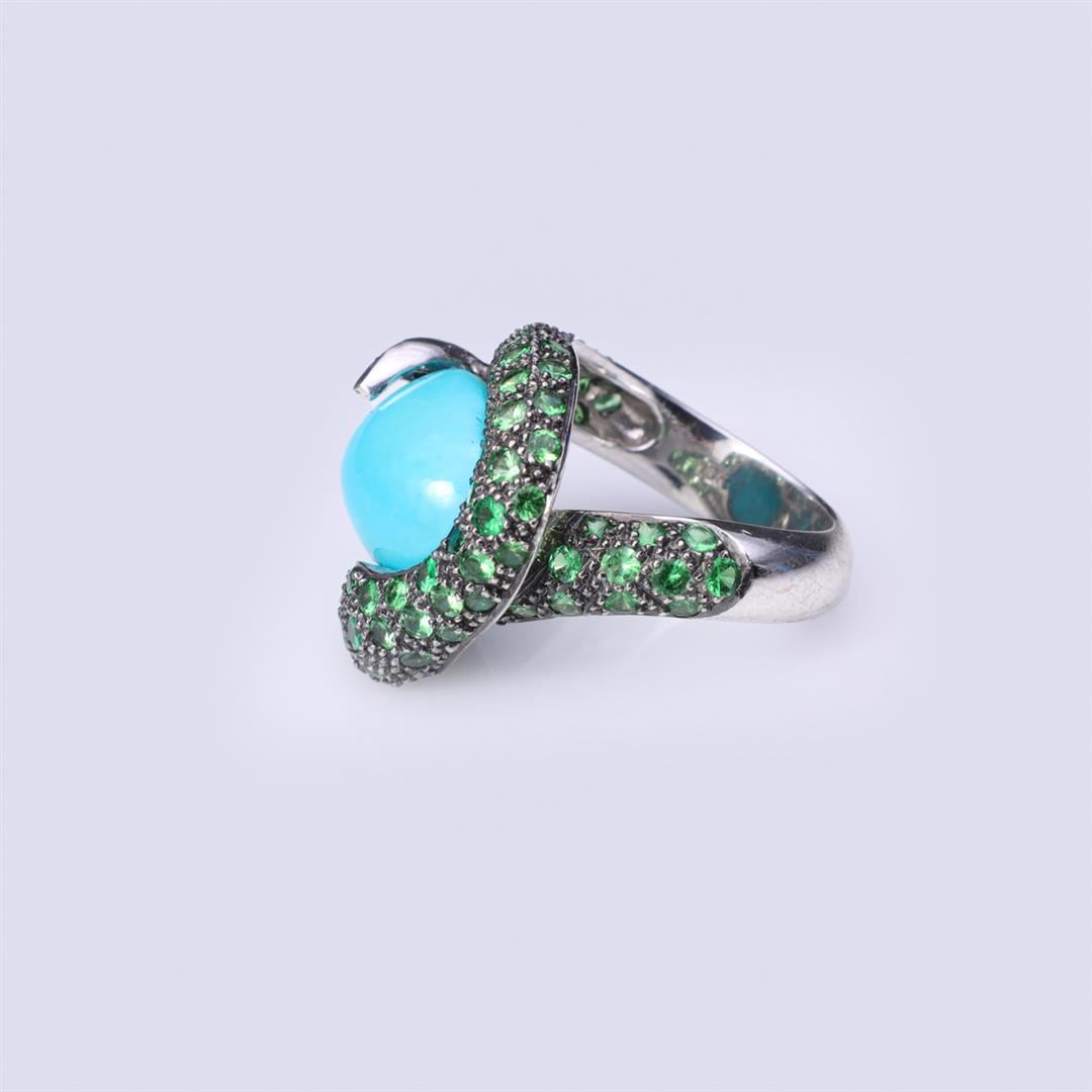 A very heavy mounted 18k white gold tsavorite garnet, ruby and turquoise ring in the form of a coiled snake wrapped around an oval turquoise cabochon; the snake well modeled with two ruby eyes and the body pave set with bright green tsavorite garnets upon