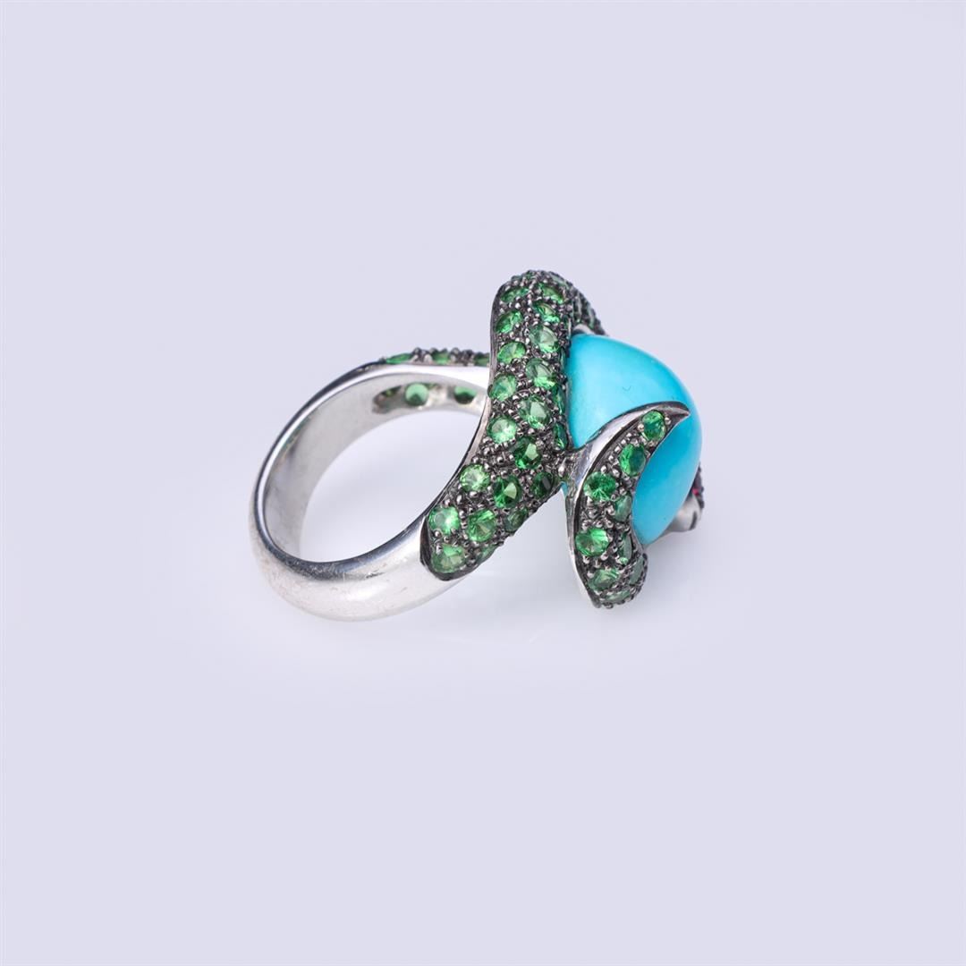 A very heavy mounted 18k white gold tsavorite garnet, ruby and turquoise ring in the form of a coiled snake wrapped around an oval turquoise cabochon; the snake well modeled with two ruby eyes and the body pave set with bright green tsavorite garnets upon