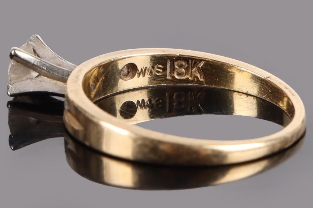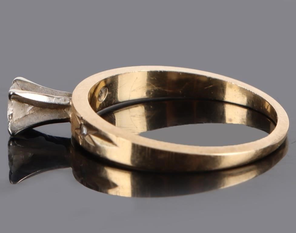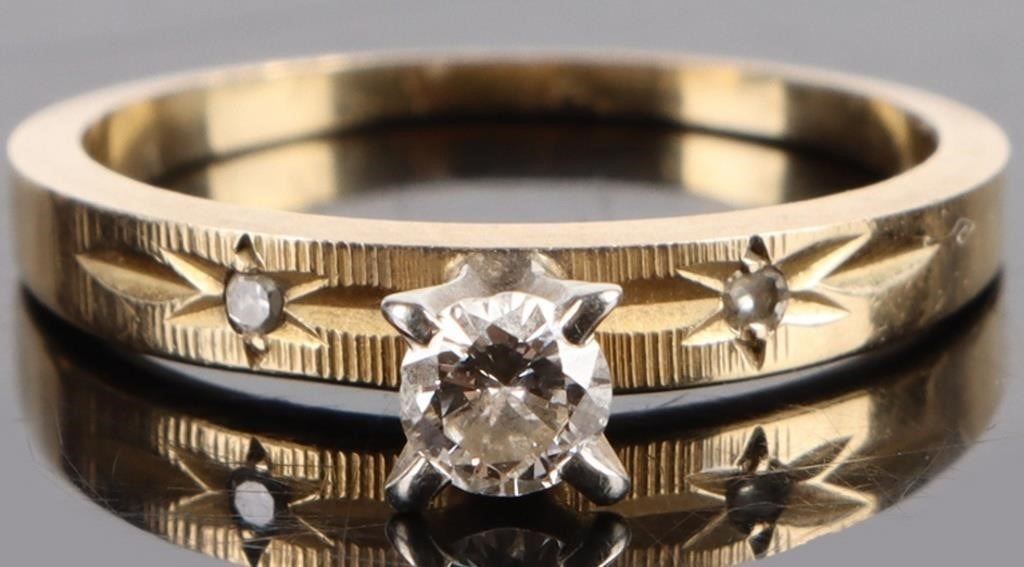 18K yellow gold 0.20CT center diamond ladies ring with two 0.01ct round diamonds.