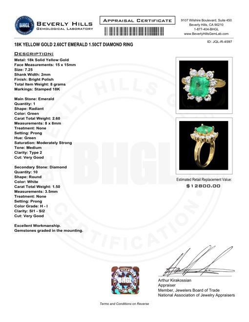 Retail: $12800.00 ****** Metal: 18k Solid Yellow Gold / Size: 7.25 / Total Item Weight: 8 grams / Country Made: USA / / Main Stone: Emerald / Color: Green / Carat Total Weight: 2.60 / Treatment: None / Clarity: Type 2 / Cut: Very Good / / Secondary Stone: Diamond / Carat Total Weight: 1.50 / Treatment: None / Color Grade: H - I / Clarity: SI1 - SI2 / Cut: Very Good / ****** Ref: JQL-R-4597