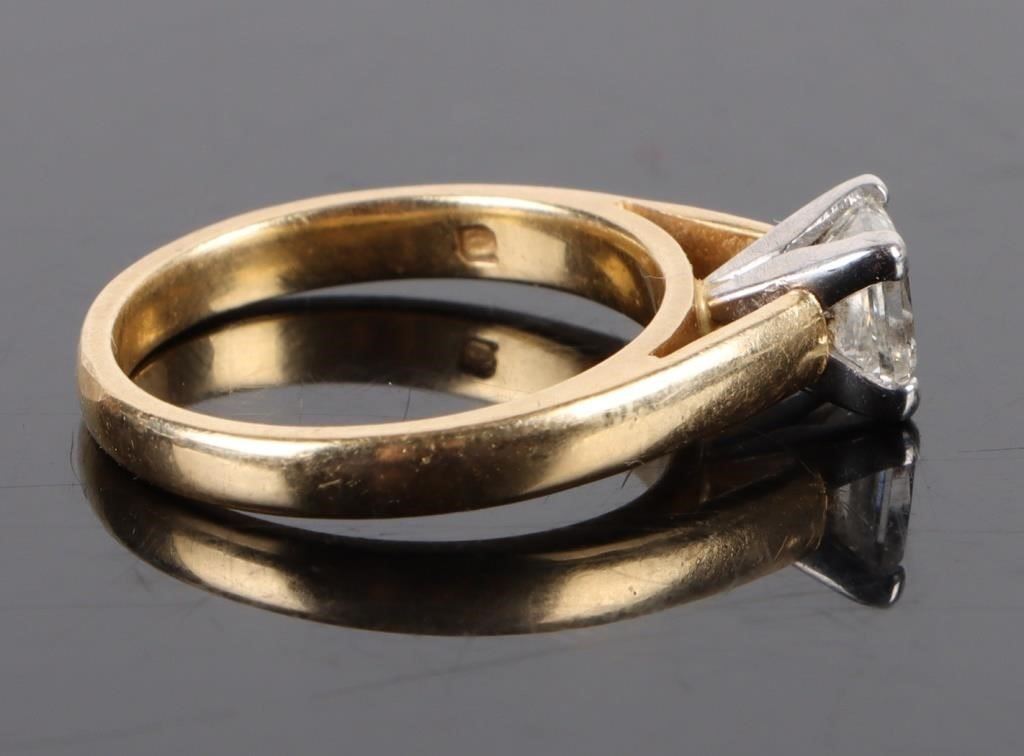 .50ct princess cut solitaire diamond ring in 18k yellow gold and while gold mount. Diamond is clear with slight visible inclusions with a loupe.