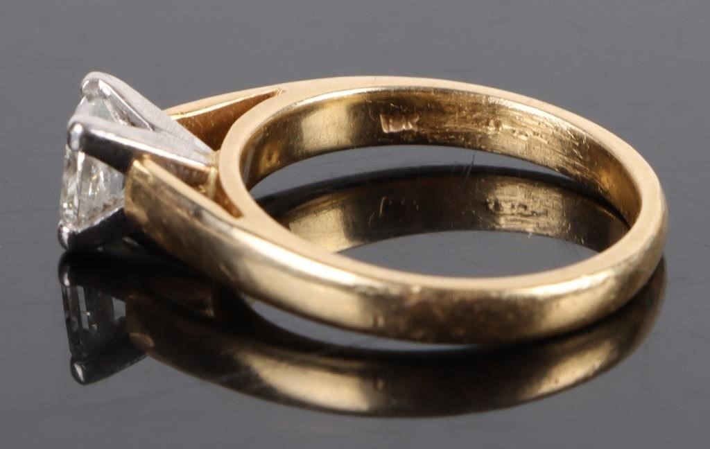 .50Ct princess cut solitaire diamond ring in 18K yellow gold and while gold mount. Diamond is clear with slight visible inclusions with a loupe.