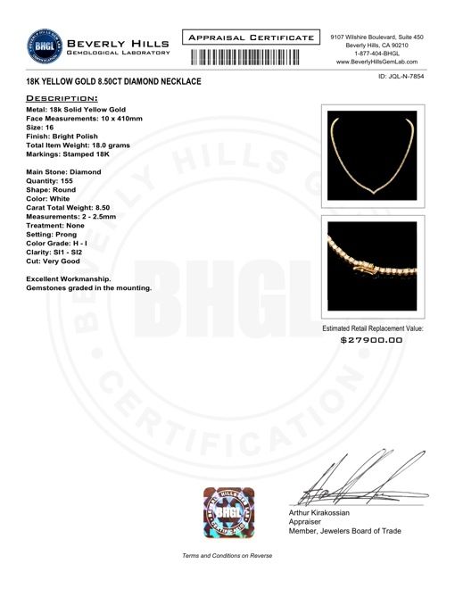 Retail: $27900.00 ****** Metal: 18k Solid Yellow Gold / Size: 16 / Total Item Weight: 18.0 grams / Country Made: USA / / Main Stone: Diamond / Color: White / Carat Total Weight: 8.50 / Treatment: None / Color Grade: H - I / Clarity: SI1 - SI2 / Cut: Very Good / ****** Ref: JQL-N-7854