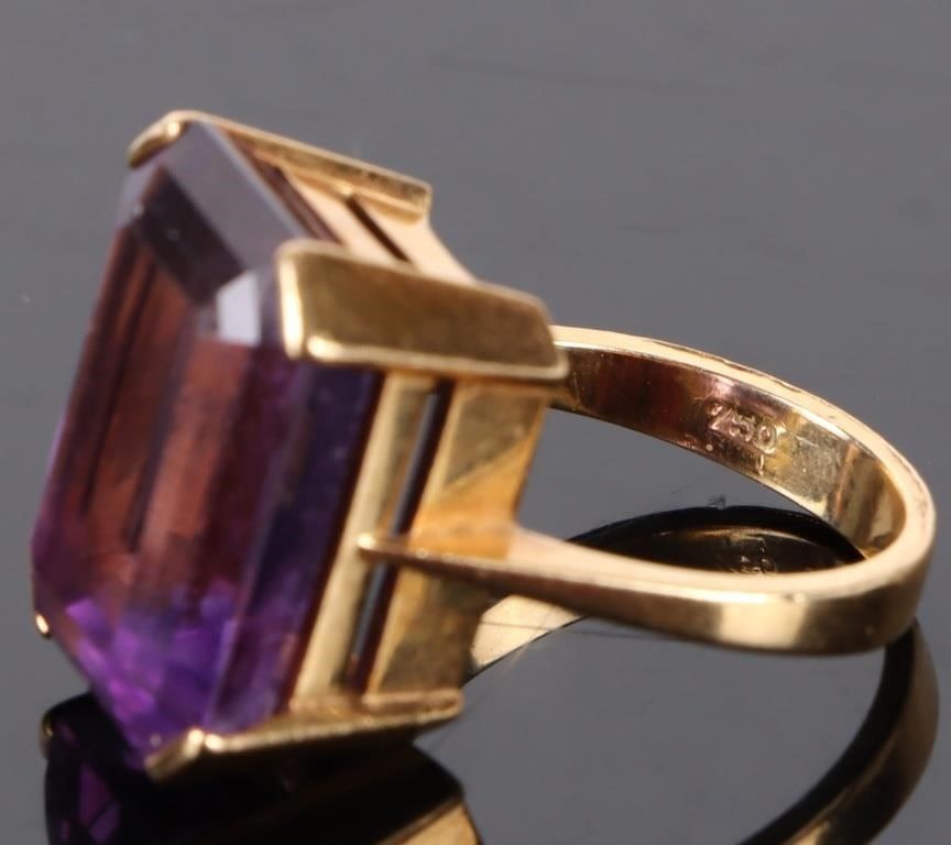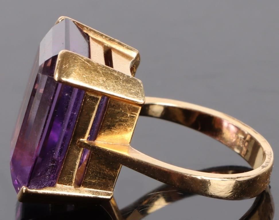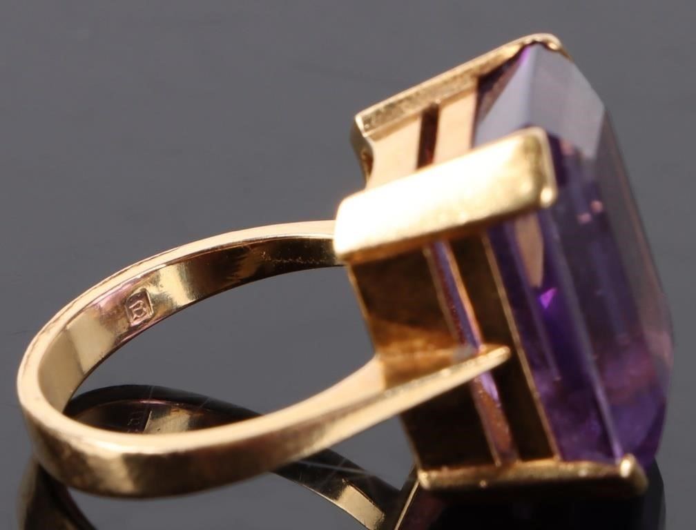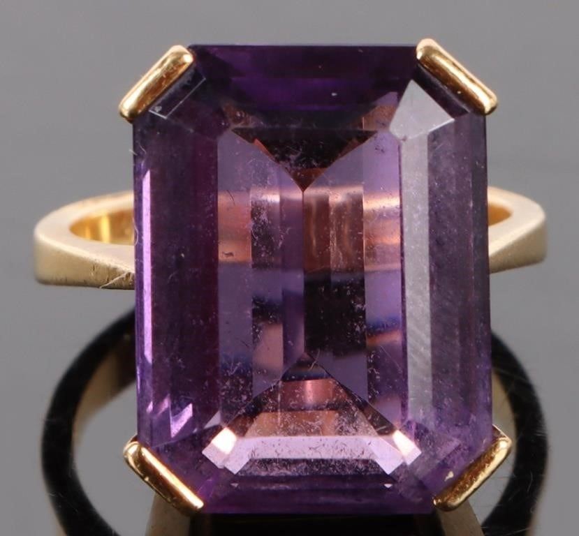 18K yellow gold amethyst ladies ring. Gemstones to include one 17.41mm X 13.88mm emerald cut amethyst headstone.