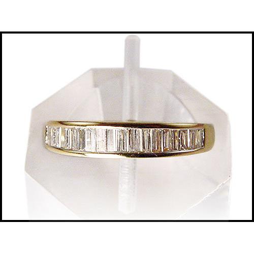 18K solid gold ring is very well made. Size 7 1/4 is easy to change. 20 sparkling white baguette cut diamonds create an elegant and tasteful ring. The decorative portion 19mm measures (3/4") across x 3mm (1/8") wide. Price was $750, and if the diamonds were a touch higher in clarity that price would be double.