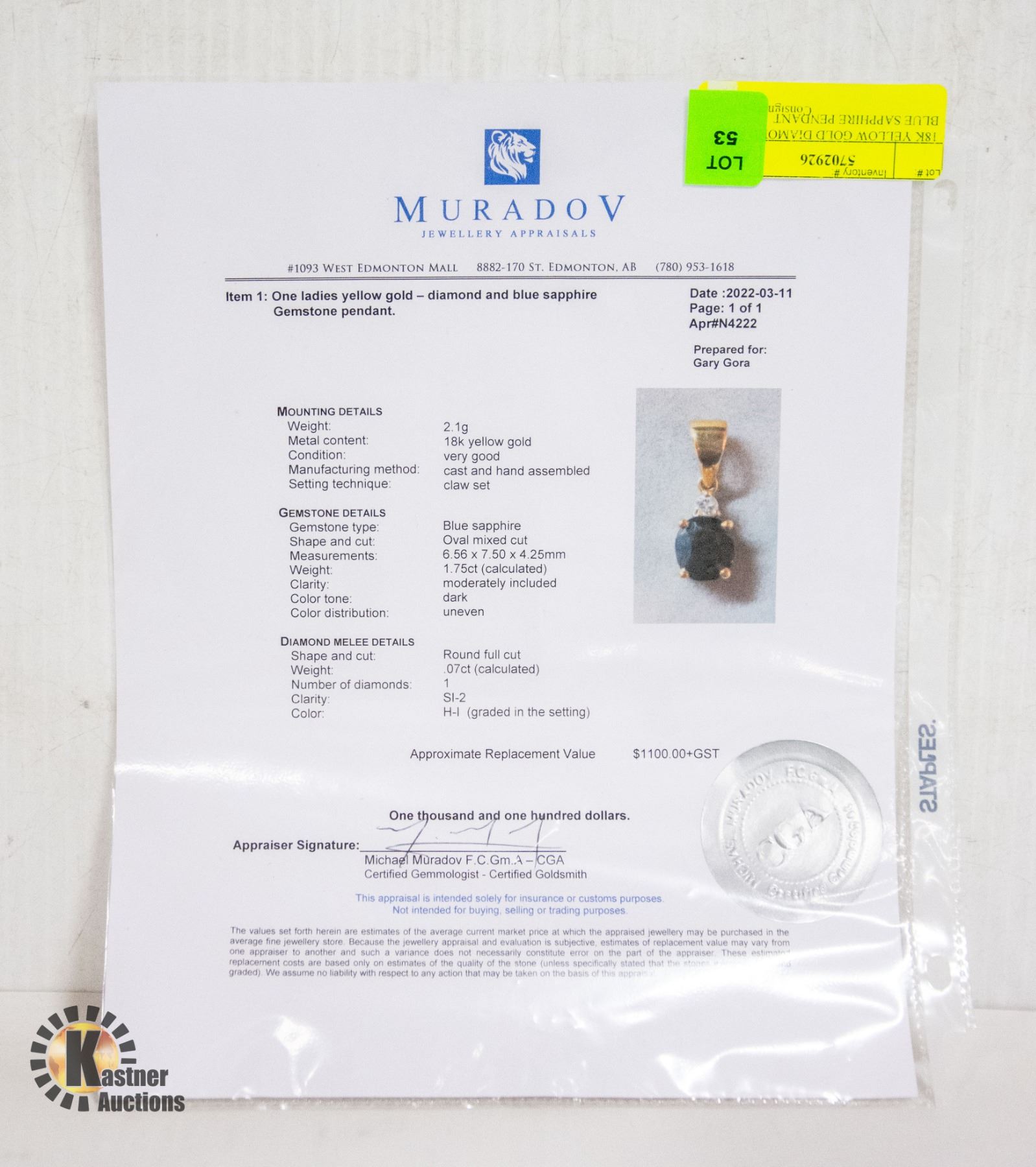 GOLD WEIGHT 2.1G, CAS AND HAND ASSEMBLED CLAW SET PENDANT SET WITH 1.75CT OVAL MIXED CUT BLUE SAPPHIRE MEASURING 6.56 X 7.50 X 4.25MM, MODERATELY INCLUDED, DARK TONE WITH UNEVEN DISTRIBUTION. DIAMOND IS A 0.7CT ROUND FULL CUT SI-2 H-I. COMES WITH APPRAISAL FROM MURADOV (N4222) WITH APPRAISED VALUE OF $1100.00 **ALL ITEMS MUST BE REMOVED BY 5PM SATURDAY, OCTOBER 14TH 2023. ALL REMAINING ITEMS WILL BE SUBJECT TO A $6.00 PER DAY STORAGE CHARGE. ANY ITEMS REMAINING AFTER MONDAY, OCTOBER 30TH, 2023 WILL BE CONSIDERED FORFEITED. NO REFUNDS WILL BE ISSUED FOR FORFEITED ITEMS. TO SCHEDULE A PICK UP APPOINTMENT CLICK HERE