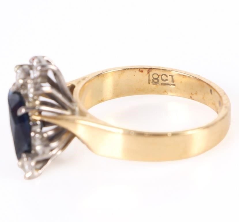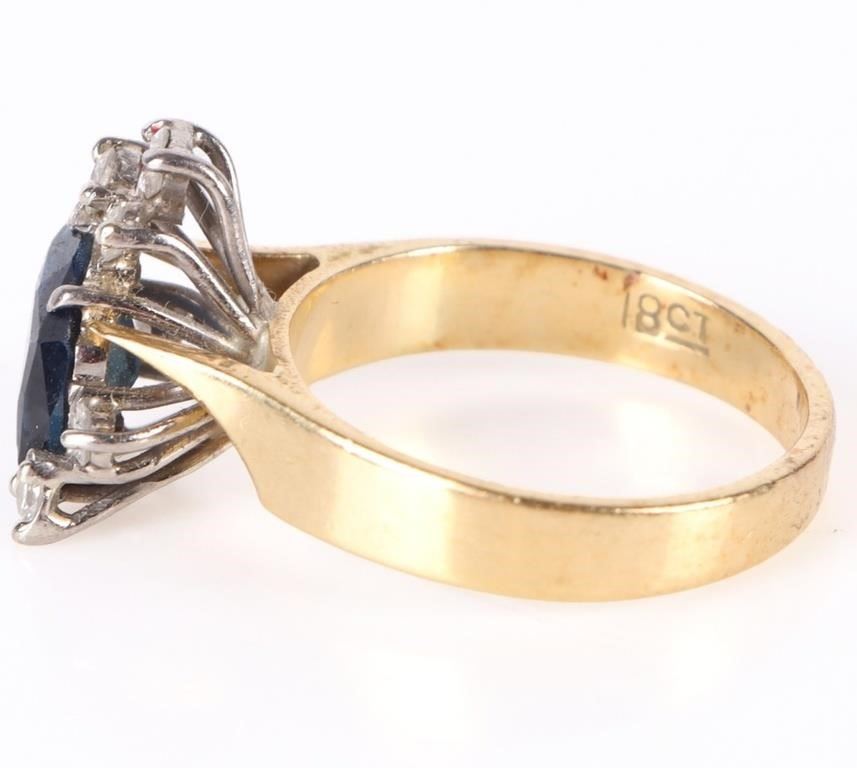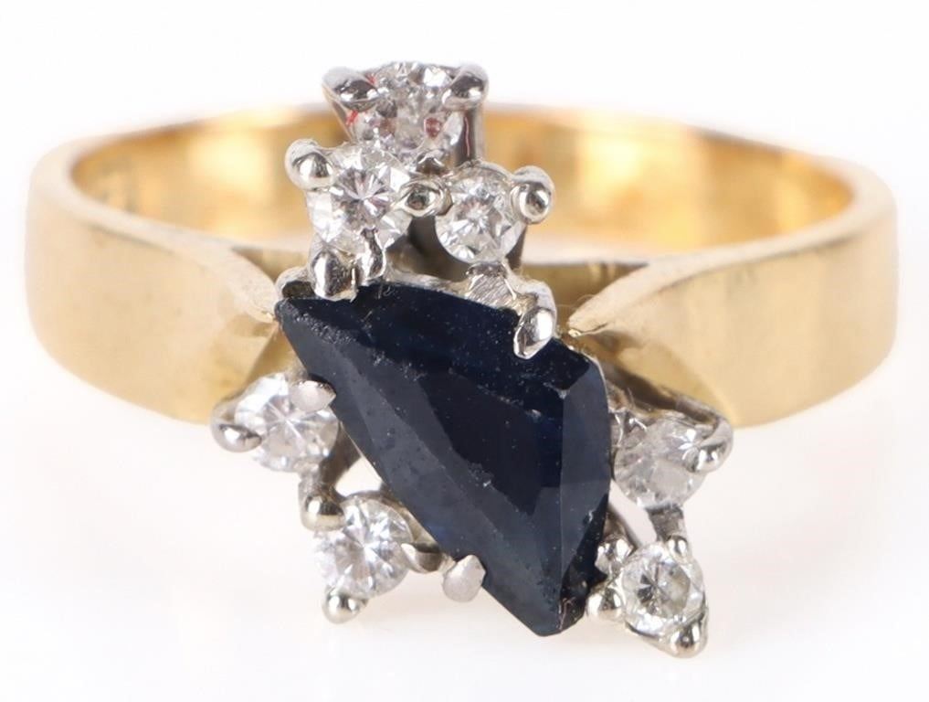 14k yellow gold diamond sapphire ladies ring with one large organic-shaped blue sapphire and seven 0.04ct round diamonds.