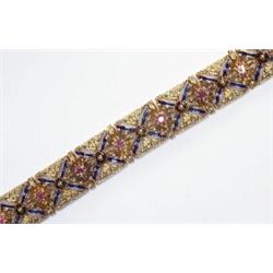 18K YELLOW GOLD FILIGREE BRACELET, formed of square links separated by 12 full cut rubies (approx. 1.40ct. total weight) and decorated with blue and red enamel, 55.6 grams