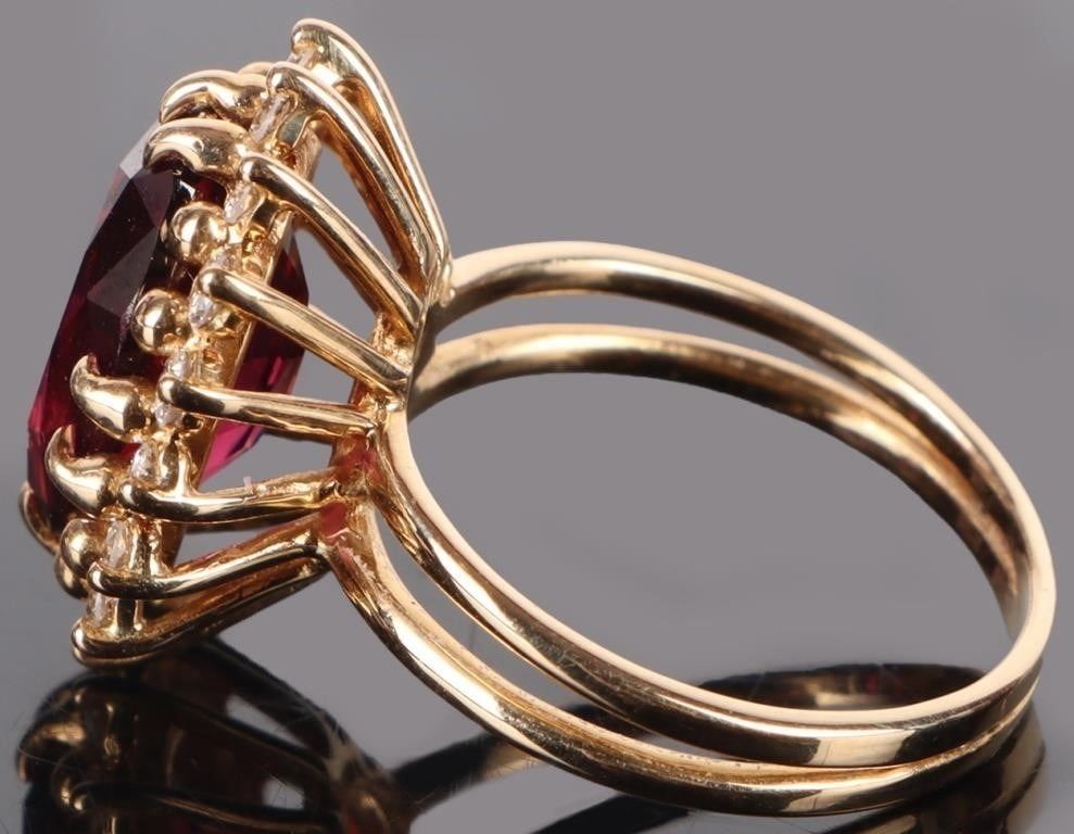 18K yellow gold garnet diamond ladies ring with one 3.0ct oval garnet and sixteen 0.02ct round diamonds.