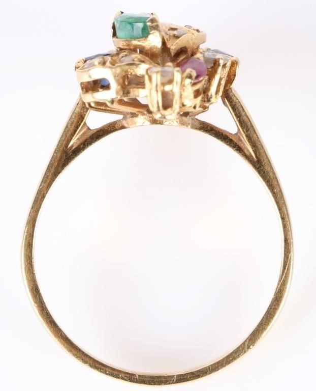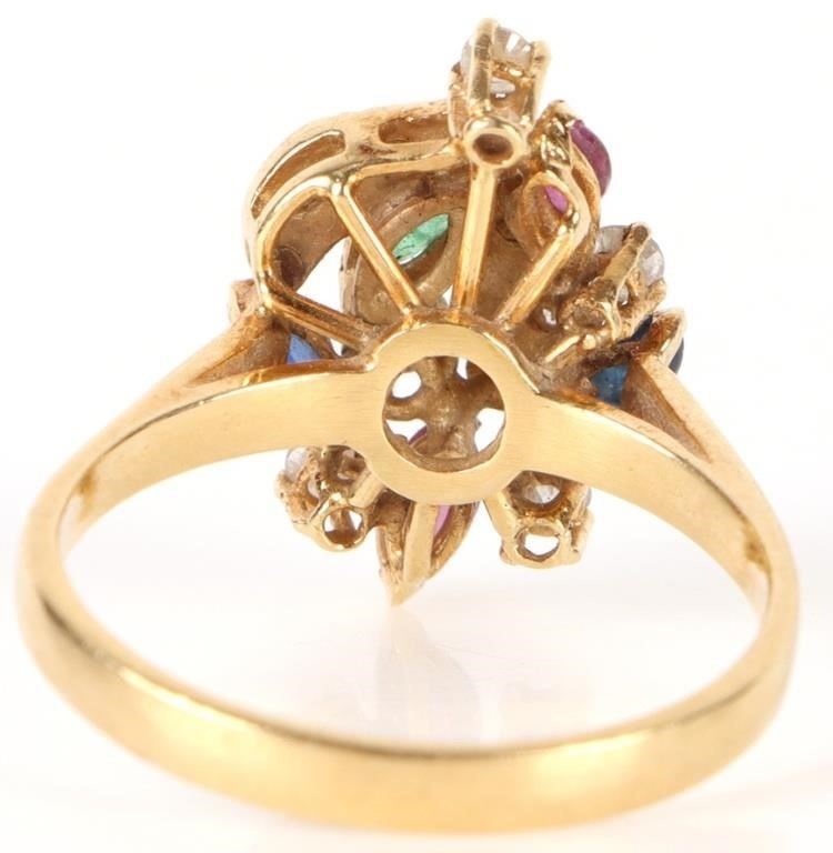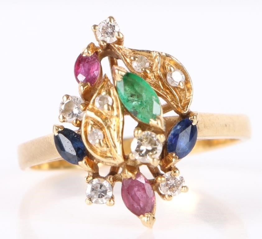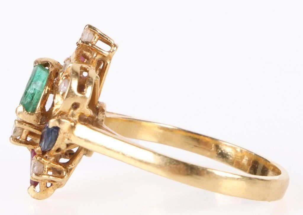 18K yellow gold multi-gemstone ladies ring to include: 0.15CT emerald, two 0.02CT sapphires, two 0.02CT rubies, four 0.02CT round diamond & one 0.07CT round diamond.