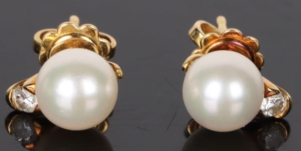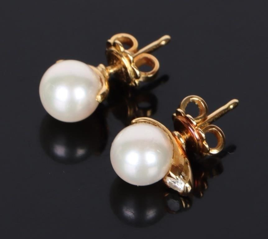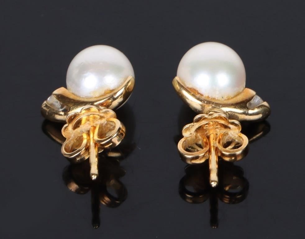 18K yellow gold pearl diamond ladies earrings to include one 0.04ct round cut diamond and one pearl for each earring.