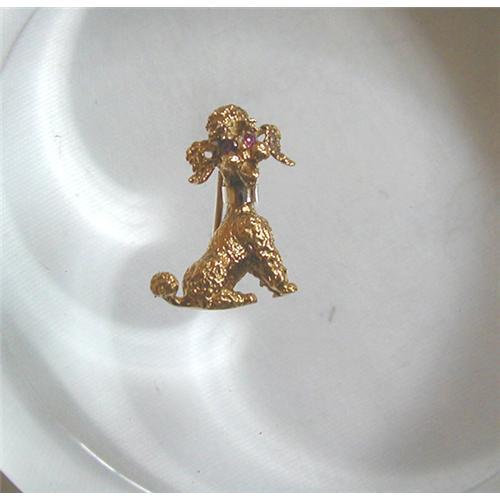 JUST THE VERY BEST POODLE PIN EVER ~ 18K Yellow Gold sitting poodle with alert ears and ruby eyes and a "poodle" gold textured body and wearing a high polish gold collar / STAMPED: 18K with maker mark / This pin is a jewel sculpture of a poodle that is as fine as you will find.