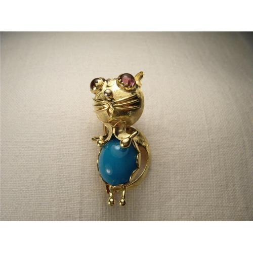 You are looking at an estate 18K yellow gold garnet and turquoise handmade cat brooch. This uniquely designed piece features 2 round garnets measuring 4 mm each and one cabochon turquoise measuring 12 mm by 10 mm. The brooch measures 1 and 3/8 inches long, including the bale by 5/8 of an inch wide. It weighs 7 grams. It is in mint condition.