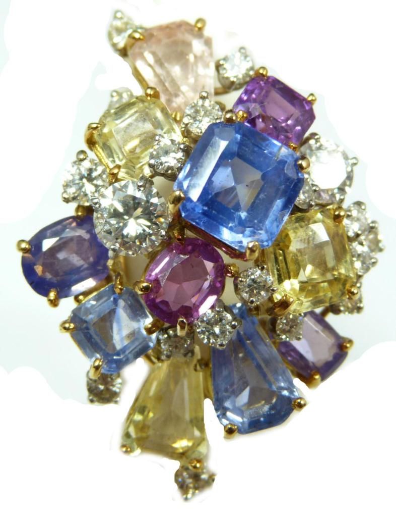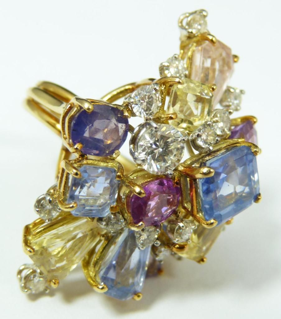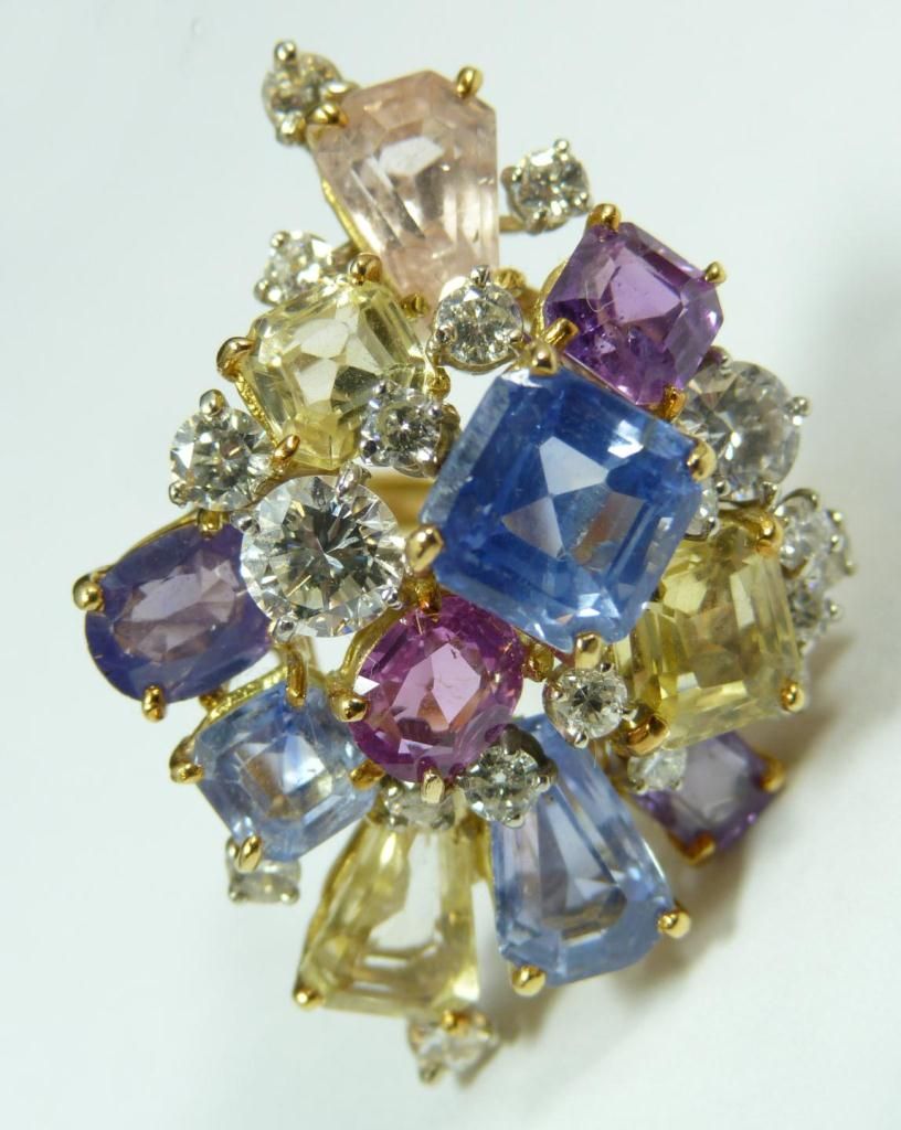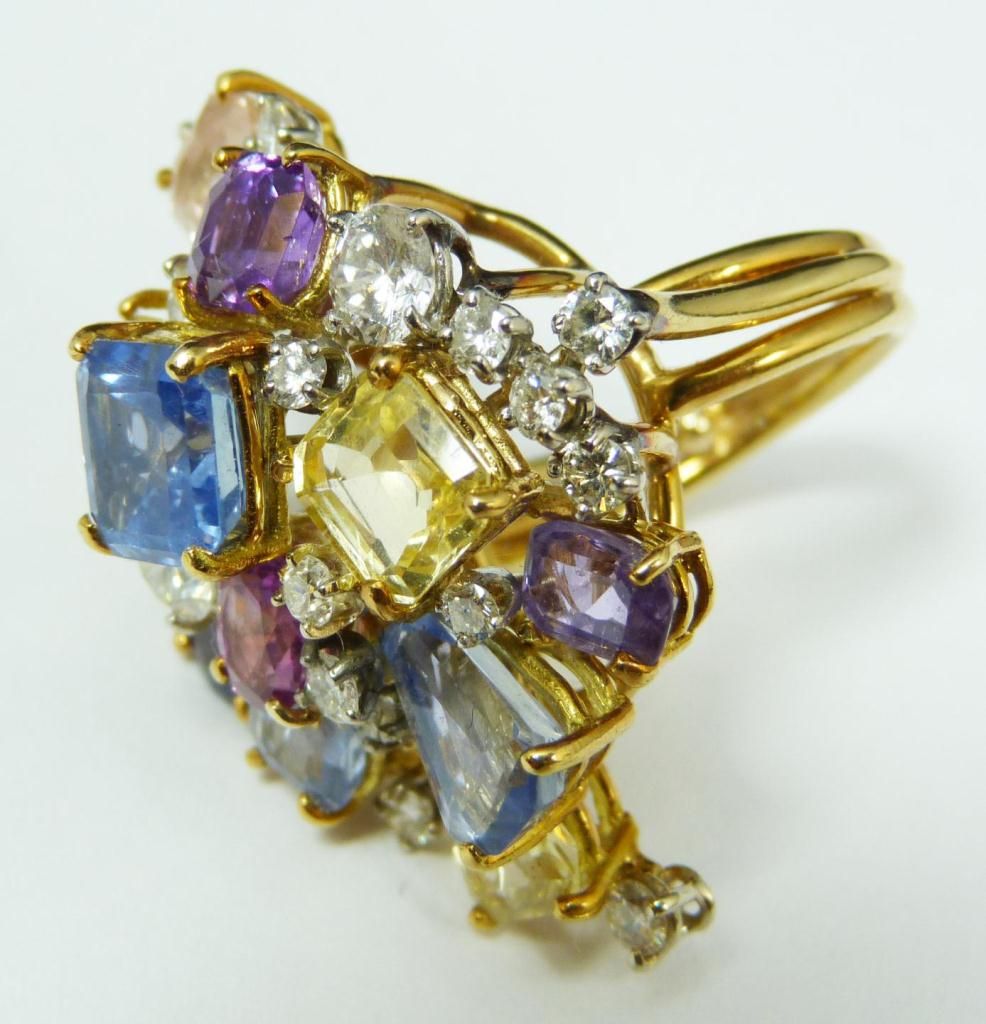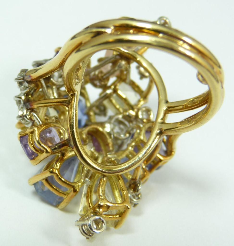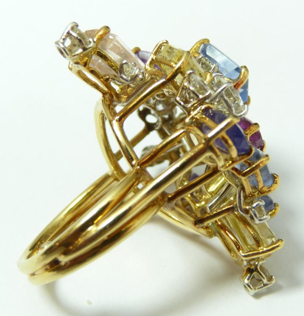 A stunning ladies 18k yellow gold multi gemstone tutti frutti diamond ring. Fabulous ring holds numerous gemstones of various cuts and sizes. Holds 19 round cut daimonds approx. 2.00ctw. Ring size 7. Total weight of 13.4dwt. Provenance: From a Stuart, Florida gentleman.