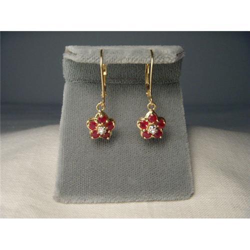 You are looking at a pair of estate 18K yellow gold earrings with diamonds and rubies. Each flower-like earring features one brilliant round diamond set in the center of 5 natural round rubies measuring 2 mm in diameter each. Each piece measures one inch long by 3/8 an inch wide. The pair weighs 1.7 grams. They are in mint condition.