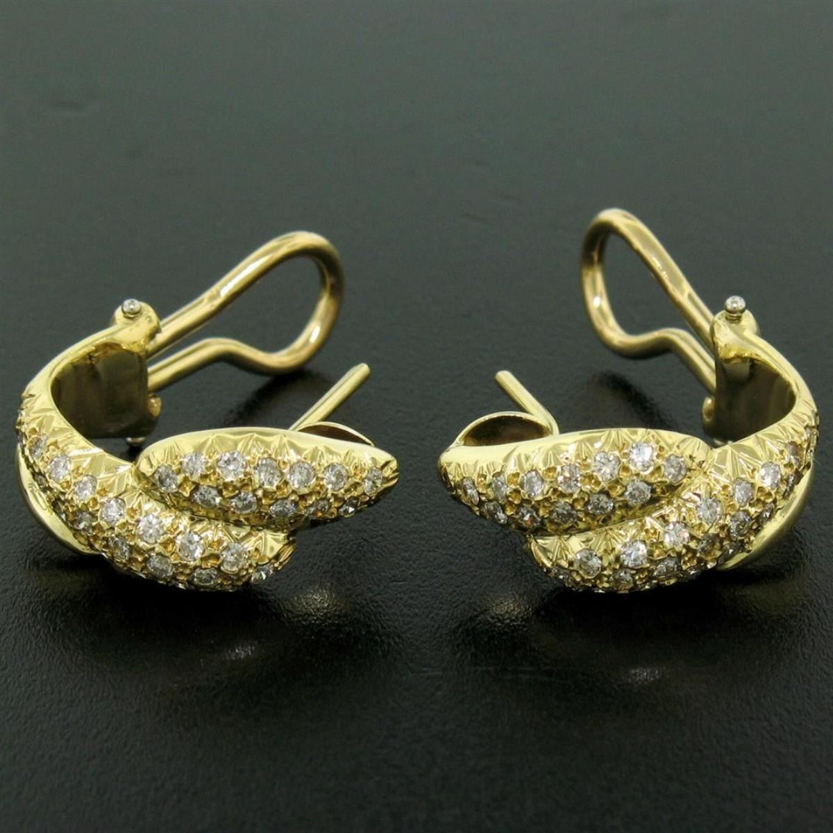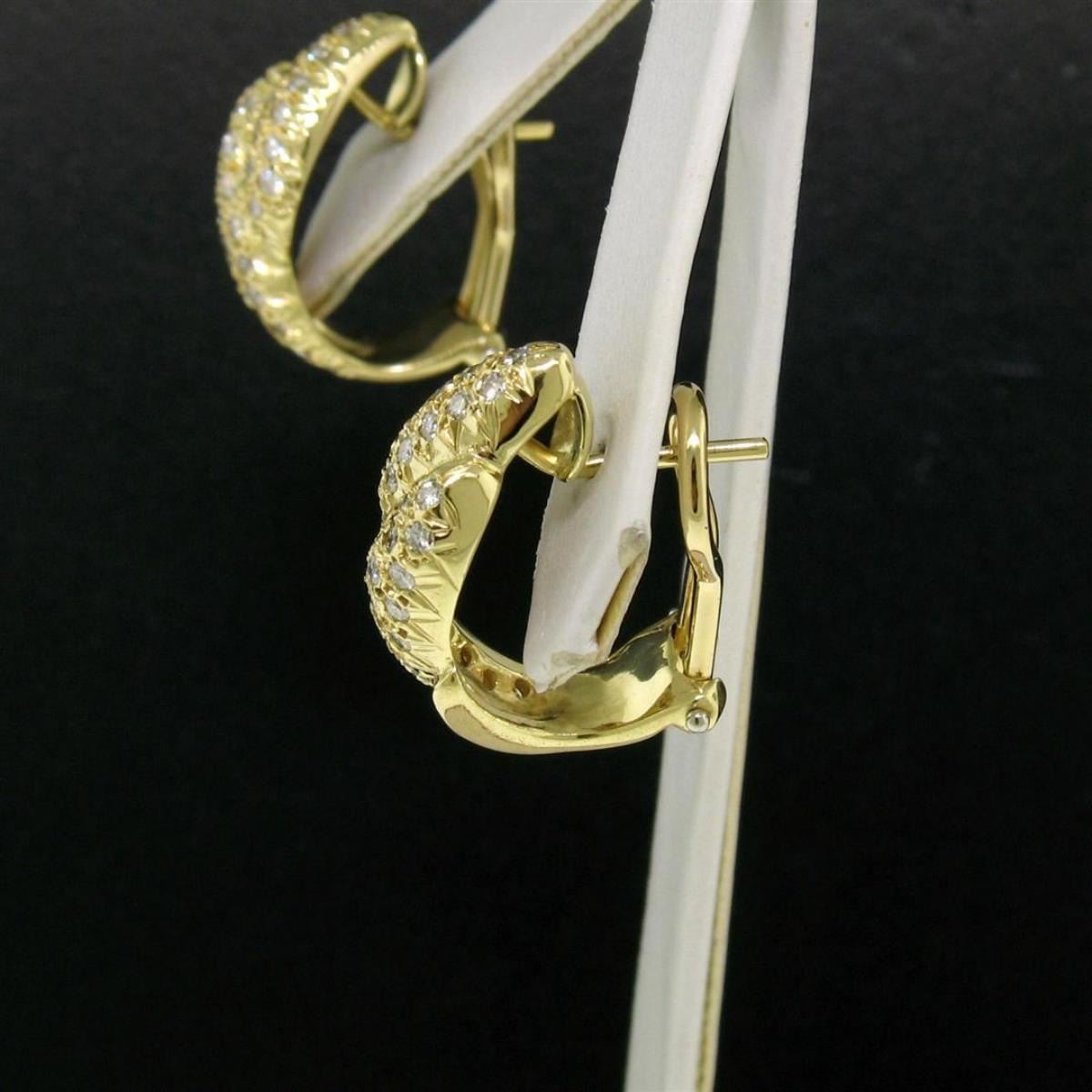 One 18K Yellow Gold 0.64ctw Pave FINE Round BRILLIANT Diamond Huggie Hoop Earrings. Item Details: Material: 18k Solid Yellow Gold, Weight: 9.09 Grams, Stone(s): (64) Natural Genuine Diamonds - Round Brilliant Cut - Pavé Set - VVS2/VS1 Clarity - E/F Color, Total Carat Weight: 0.64 (approx.), Backing: Omega Fastenings w/ Posts (Pierced ears are required.), Width: 8.63mm, Height: 19.17mm, Thickness: 8.05mm projection off the ear Condition: Like New!