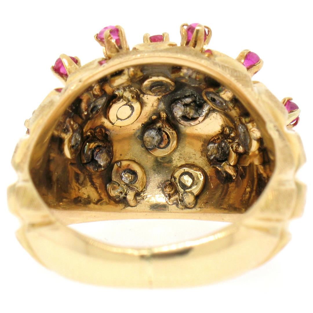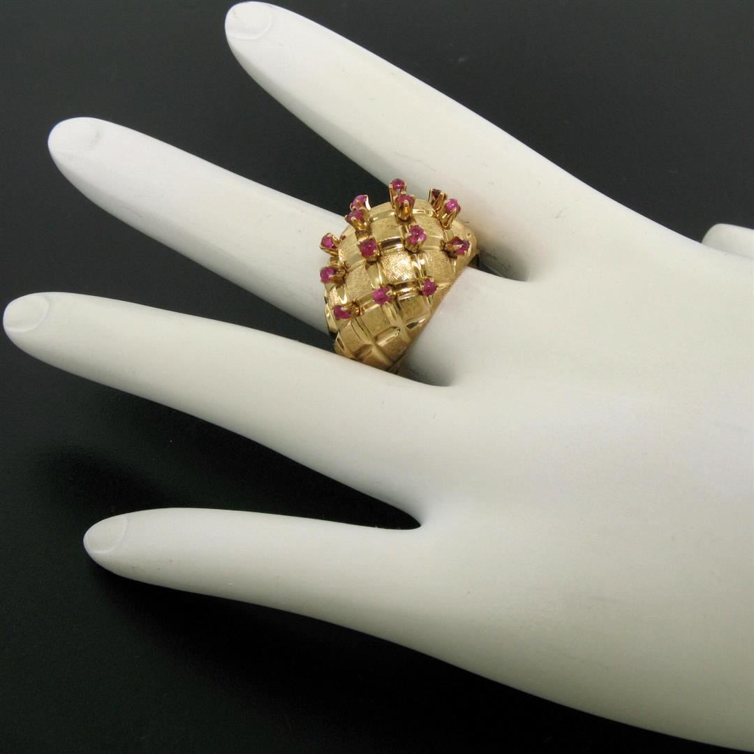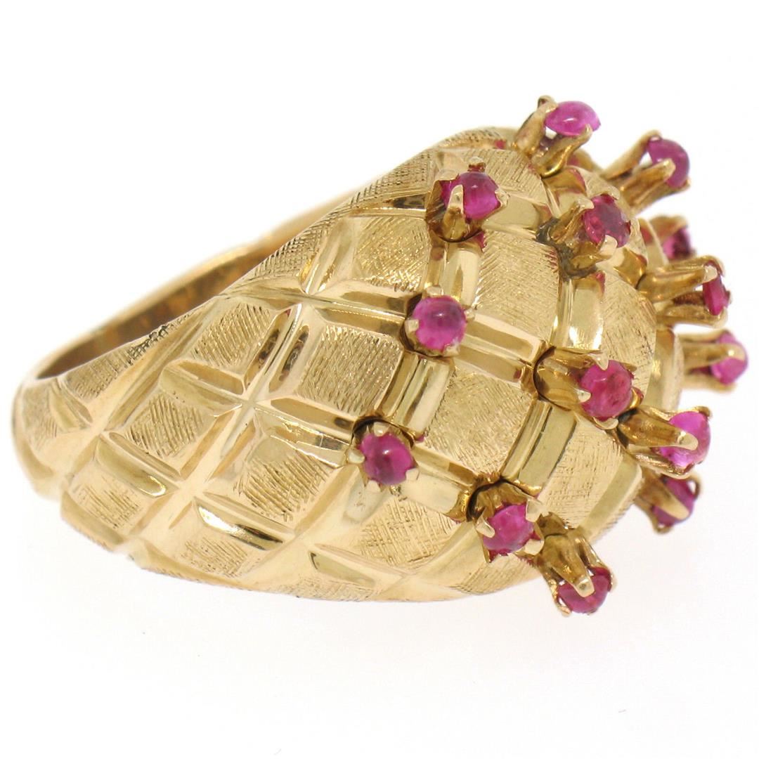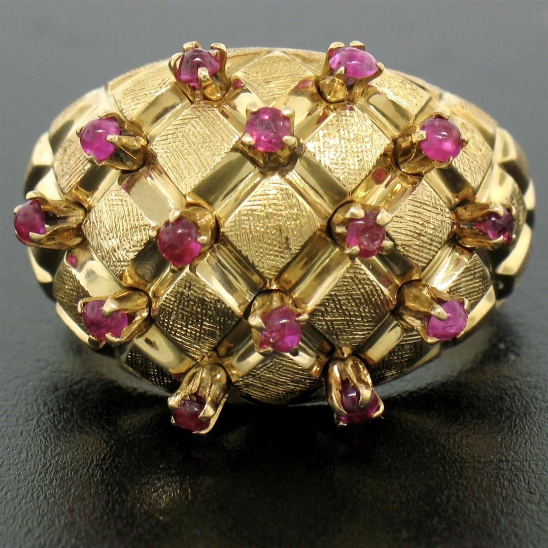 One Antique 18K Yellow Gold 0.70ctw Prong Set Cabochon Ruby Cluster Checkerboard Cocktail Ring. Item Details: Material: 18K Solid Yellow Gold, Weight: 17.50 Grams, Stone(s): (14) Natural Genuine Rubies - Round Cabochon Cut - Prong Set - Blood Red Color - 0.70ctw (approx.), Ring Size: 7.0 (We can custom size this ring.), Ring Width: 15.65mm, Ring Height: 8.15mm rise off the finger, Condition: Antique piece. One stone is chipped. Excellent overall condition!,