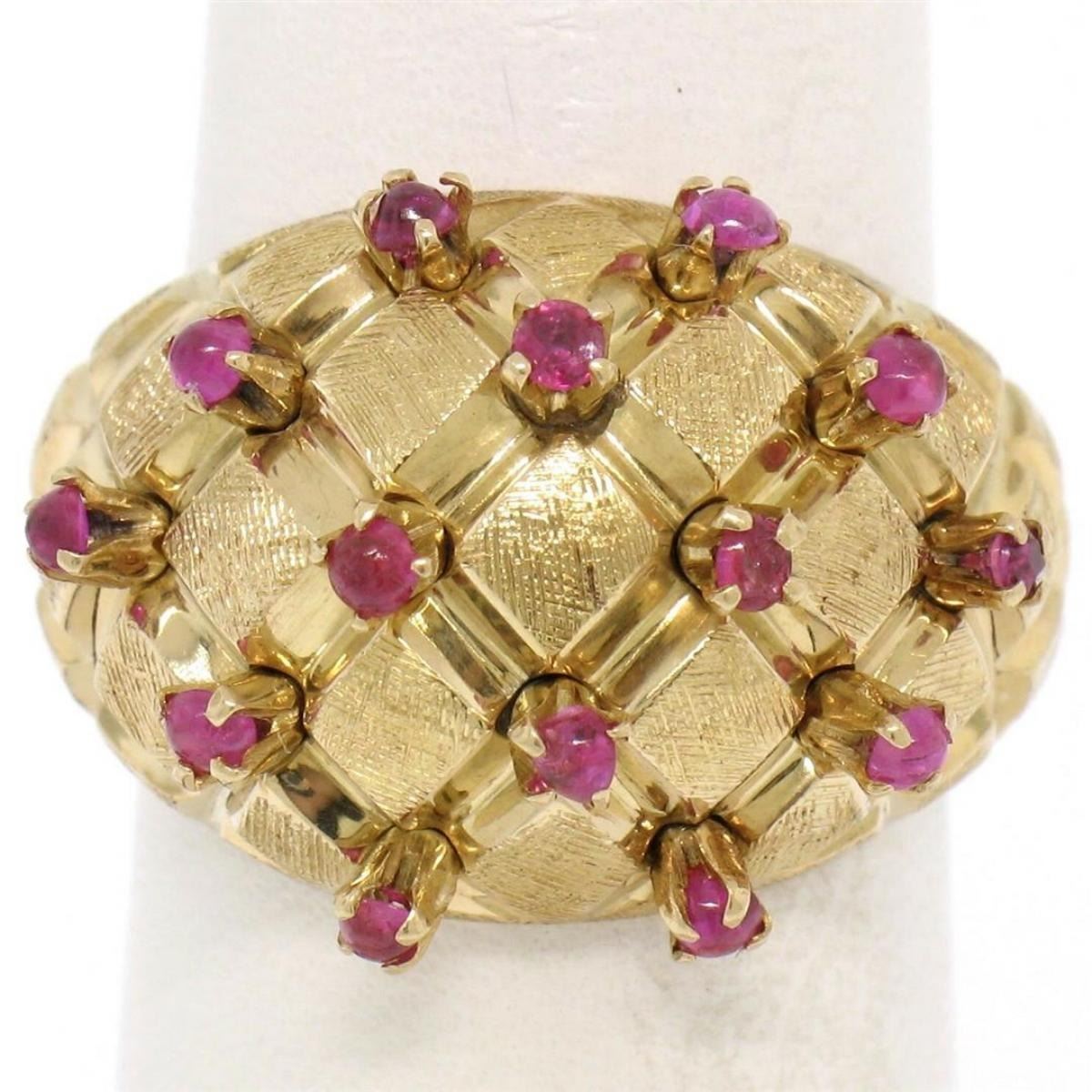 One Antique 18K Yellow Gold 0.70 ctw Prong Set Cabochon Ruby Cluster Checkerboard Cocktail Ring. Item Details: Material: 18K Solid Yellow Gold, Weight: 17.50 Grams, Stone(s): (14) Natural Genuine Rubies - Round Cabochon Cut - Prong Set - Blood Red Color - 0.70 ctw (approx.), Ring Size: 7.0 (We can custom size this ring.), Ring Width: 15.65mm, Ring Height: 8.15mm rise off the finger, Condition: Antique piece. One stone is chipped. Excellent overall condition!,