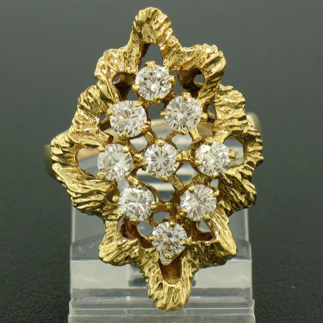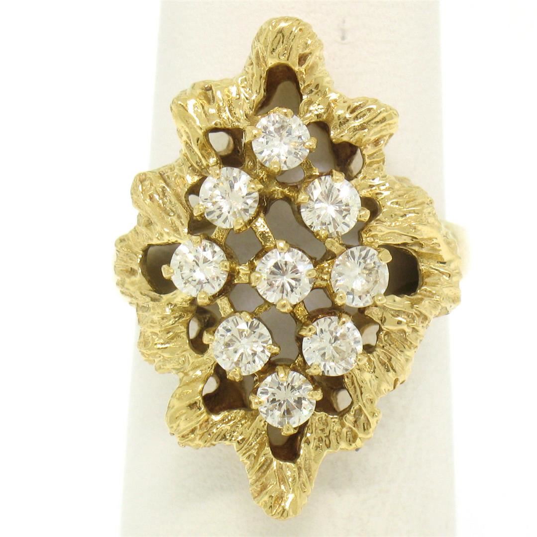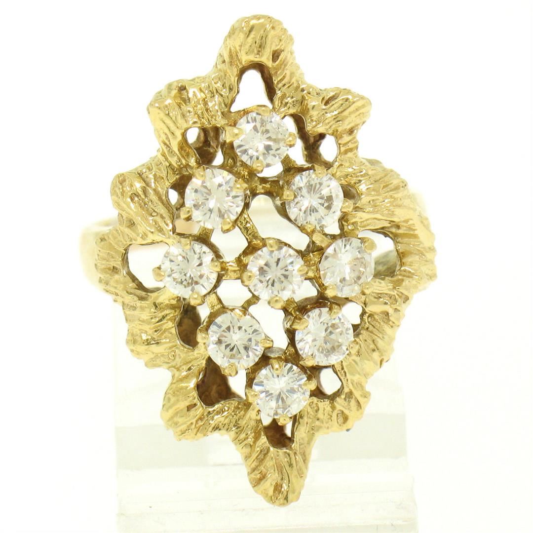 One Estate 18K Yellow Gold 1.00ctw F VS1 Diamond Open Textured Nugget Cocktail Ring. Item Details: Material: 18K Solid Yellow Gold, Weight: 7.0 Grams, Stone(s): (9) Natural Genuine Diamonds - Round Brilliant Cut - Prong Set - F Color - VS1 Clarity - 1.00ctw (approx.), Total Carat Weight: 1.00 (approx.), Ring Size: 6.5 (We can custom size this ring.), Ring Width: 26.15mm, Ring Height: 9.56mm rise off the finger, Condition: Like New!