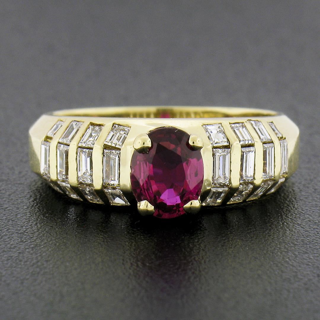 A solid 18k yellow gold ring, featuring 1 GIA graded oval cut natural ruby (0.83ct), and 24 baguette cut natural diamonds (F/G - VS1/VS2 w/ Few SI1 ; 0.60ctw). The ring is size 6.5, weighs a total of 5.23 grams, and measures 6.6mm wide. Comes with all original relevant certifications.