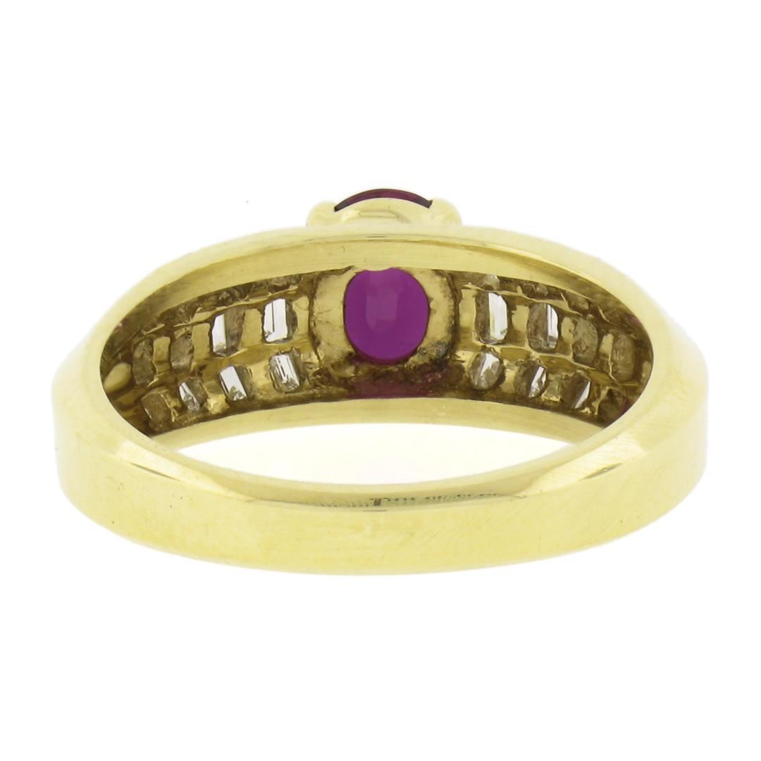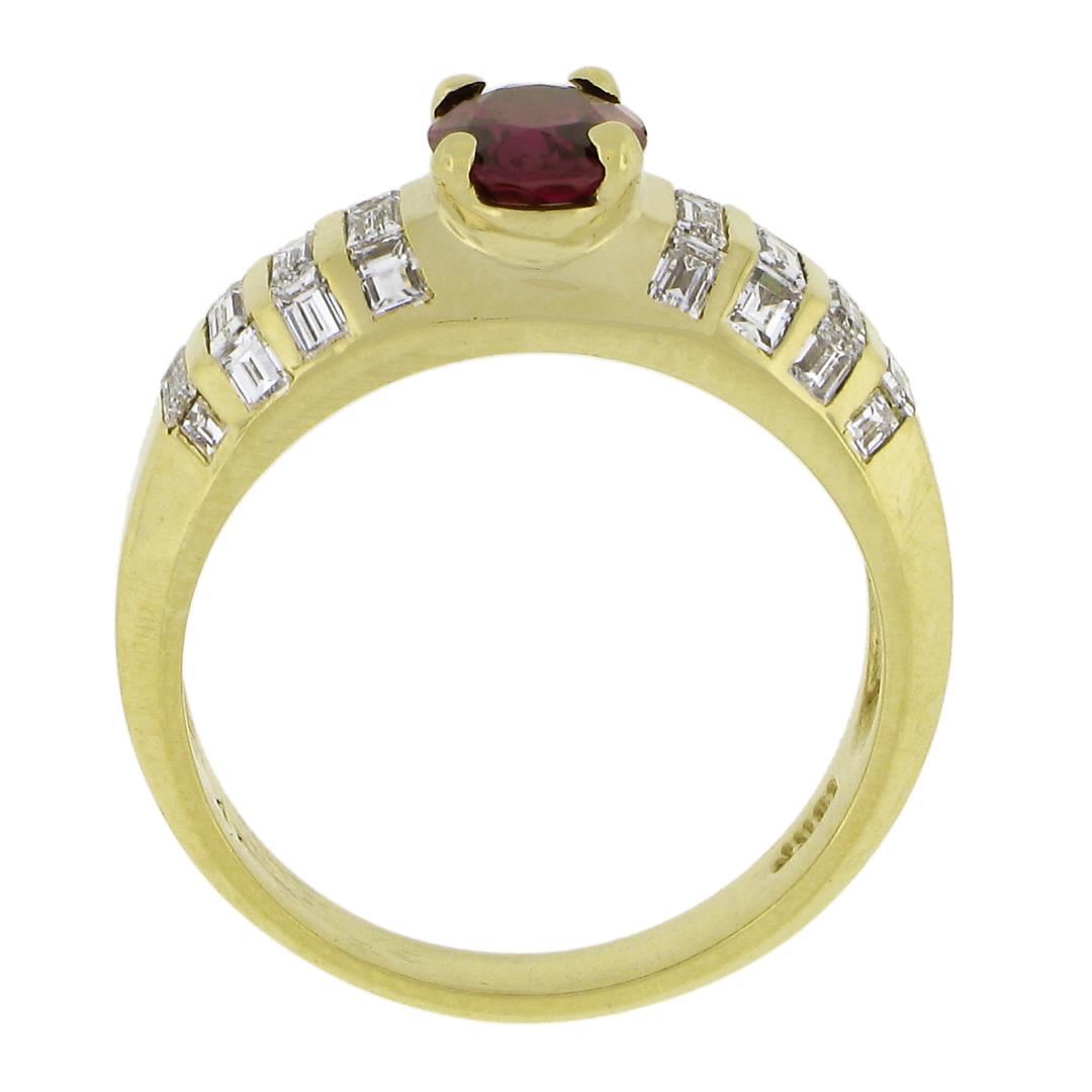 A solid 18k yellow gold ring, featuring 1 GIA graded oval cut natural ruby (0.83ct), and 24 baguette cut natural diamonds (F/G - VS1/VS2 w/ Few SI1 ; 0.60ctw). The ring is size 6.5, weighs a total of 5.23 grams, and measures 6.6mm wide. Comes with all original relevant certifications.
