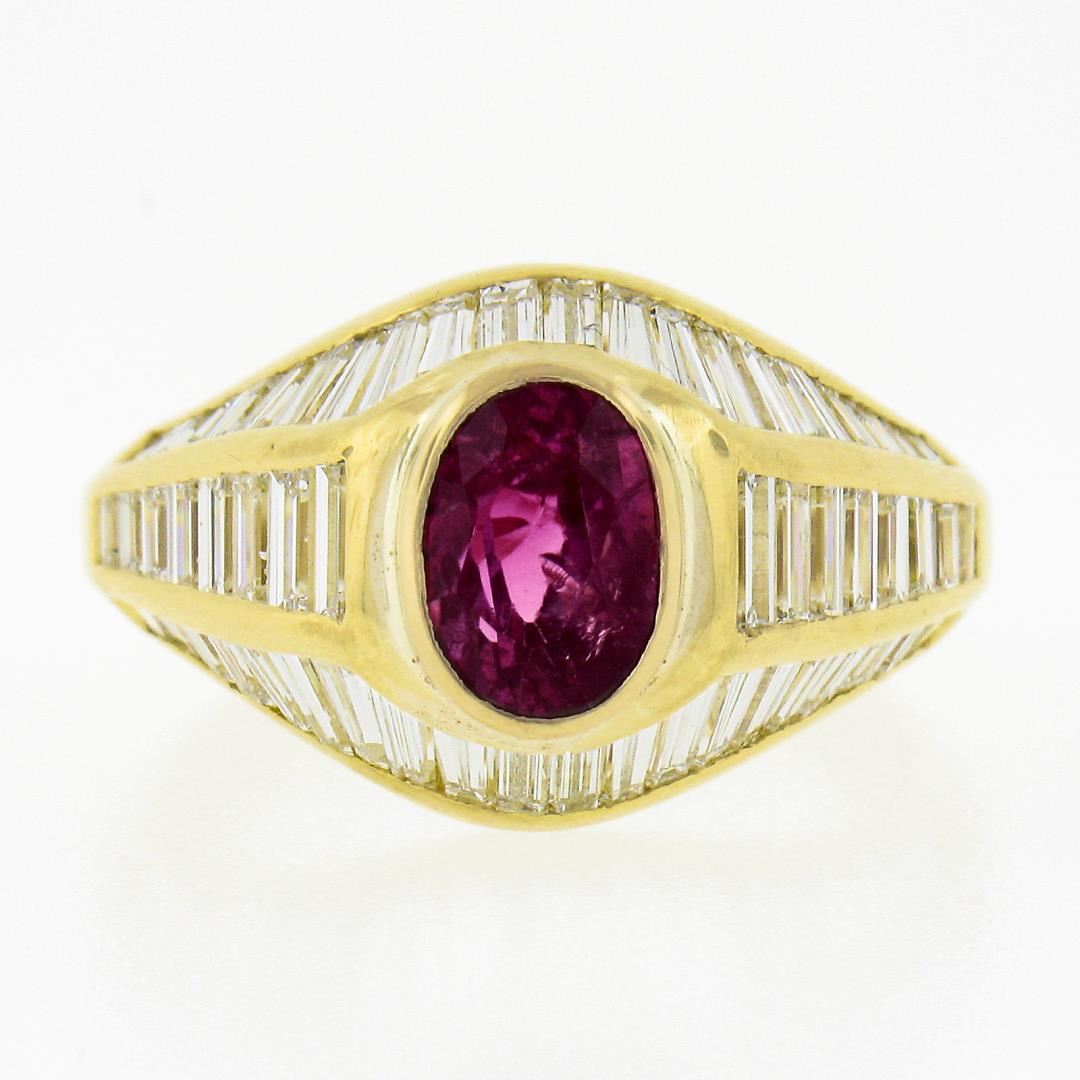 A solid 18k yellow gold ring, featuring 1 GIA graded oval cut natural ruby (1.85ct), and 56 caliber baguette & square step cut natural diamonds (H-J - VS1/VS2 ; 2.0ctw). and The ring is size 7.0, weighs a total of 6.24 grams, and measures 13mm wide. Comes with all original relevant certifications.