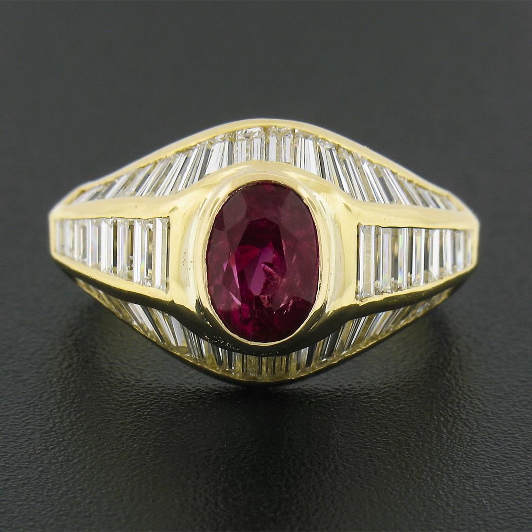 A solid 18k yellow gold ring, featuring 1 GIA graded oval cut natural ruby (1.85ct), and 56 caliber baguette & square step cut natural diamonds (H-J - VS1/VS2 ; 2.0ctw). and The ring is size 7.0, weighs a total of 6.24 grams, and measures 13mm wide. Comes with all original relevant certifications.