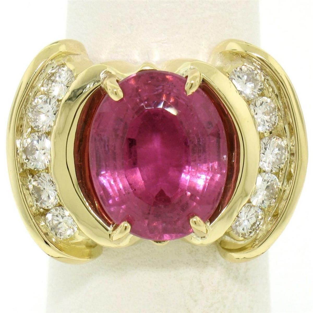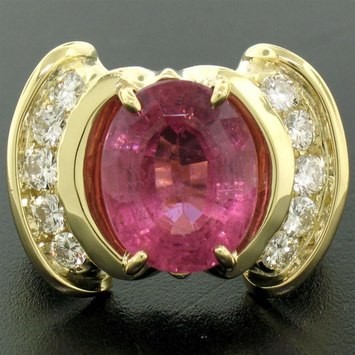 One LARGE 18K Yellow Gold 6.54ct Oval Pink Tourmaline & Round Diamond Cocktail Ring. Item Details: Material: 18K Solid Yellow Gold, Weight: 14.48 Grams, Stone(s): (1) Natural Genuine Tourmaline - Oval Step-Style Cut - Prong Set - Rich and Vivid Pink Color - 13.25x10.70mm / 6.54ct (approx.), (10) Natural Genuine Diamonds - Round Brilliant Cut - Channel Set - F Color - VS1 Clarity - 0.90ctw (approx.), Total Carat Weight: 7.44 (approx.), Ring Size: 6.5, Ring Width: 17.68mm, Ring Height: 7.30mm rise off the finger Condition: Outstanding, like new condition!