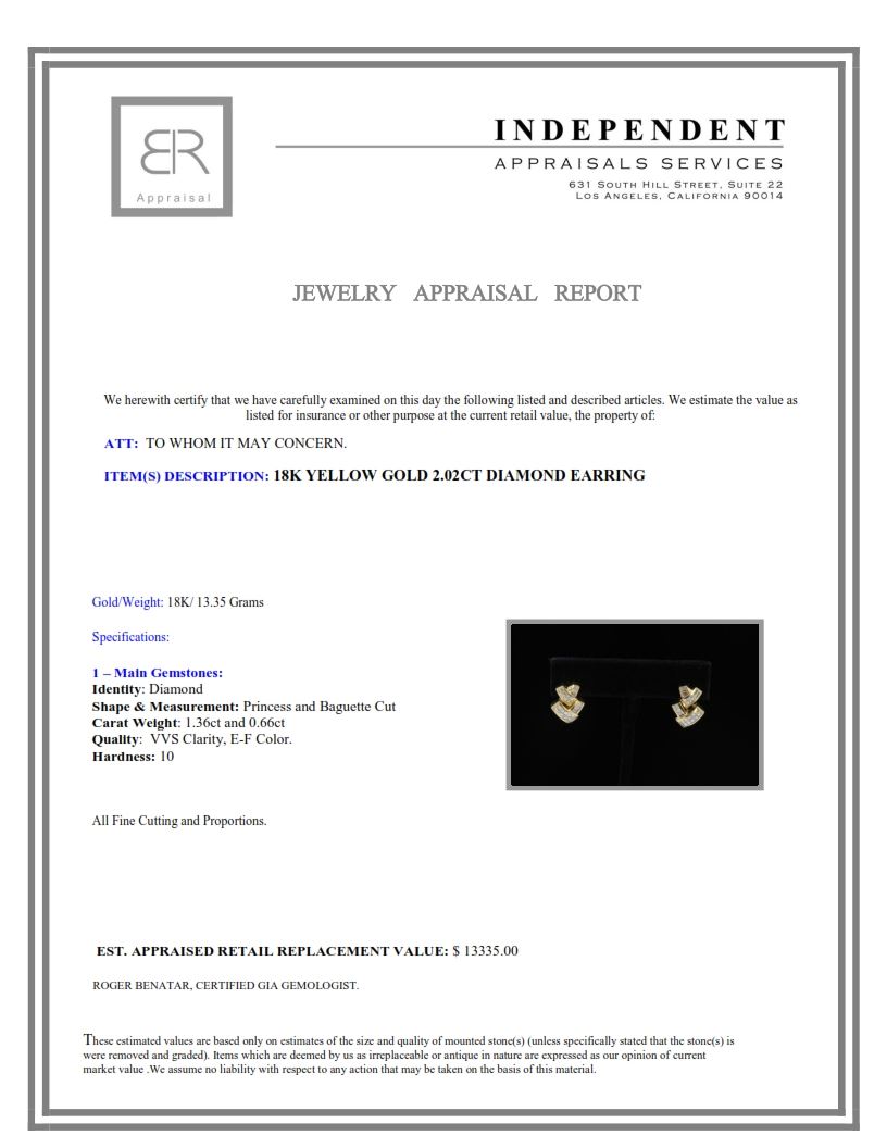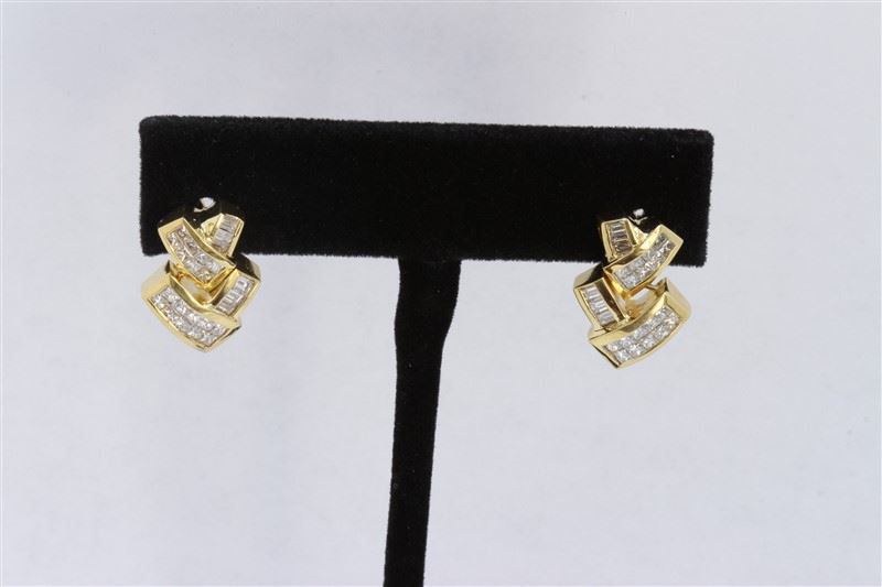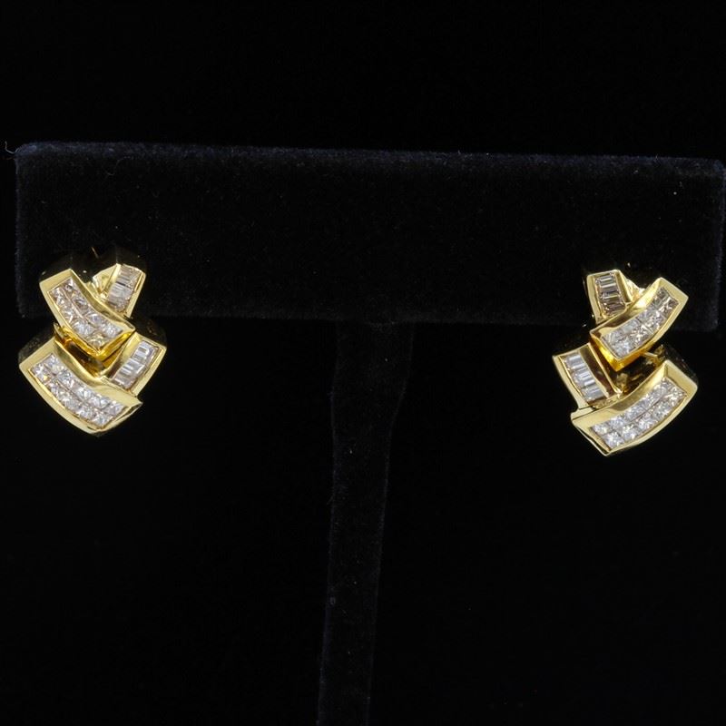 18K Yellow Gold And Diamond Earring Princess Shape Diamond(invisible Setting)- 1.36ct baguette Shape Diamond- 0.66ct Weight-13.35grams/Diamond Color: E-F /Diamond Clarity: VVS/Style#: 285E/Item No : 13587