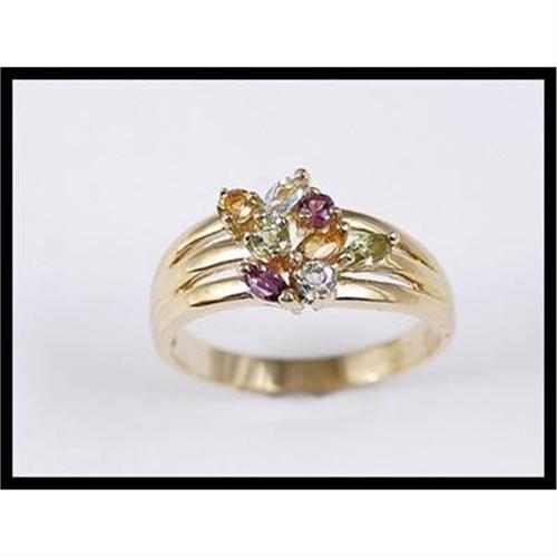 Adorable ring with 1 marquee cut and 1 round cut aquamarine that weigh 0.13 carats, 1 marquee and 1 round cut green peridot that weigh 0.17 carats, 1 marquee and 1 round cut citrine that weigh 0.15 carats, and 1 marquee and 1 round cut rhodolite that weigh 0.18 carats set in 18K yellow gold. The size 7 ring measures 9.7 millimeters (0.38 inches) wide and weighs 3.80 grams total weight.