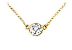 A round diamond is delicately suspended in a rich 18K yellow gold bezel-setting. This diamond solitaire pendant has a total weight (TDW) of 1.00 ct and comes with a standard 16 14K gold chain.