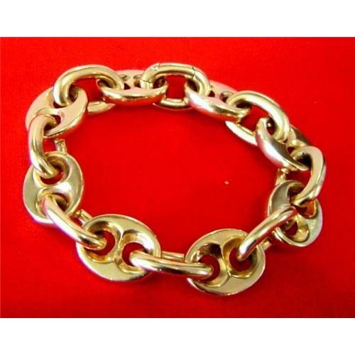 European. Weighs 72.8 dwt or 3.6 troy ounces of gold Wonderful design. Alternating two styles of Gucci-style links. 7.5 inches long. Each link is approximately .75 inches long and .50 inches wide. 8 links of each of the two designs.
